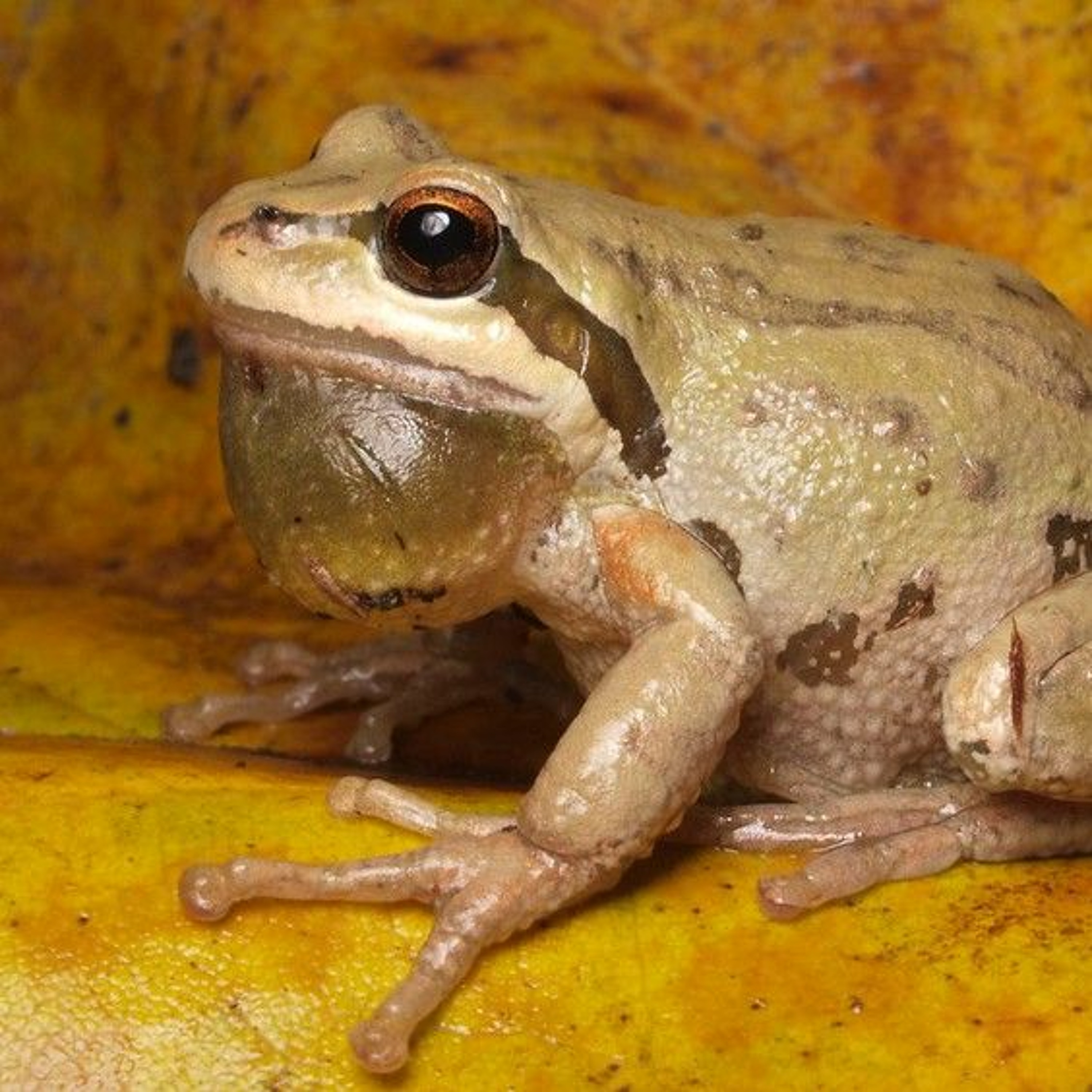 A series of short whistled hoots mixes with the cresendo of ‘rib-its’ in the audio.