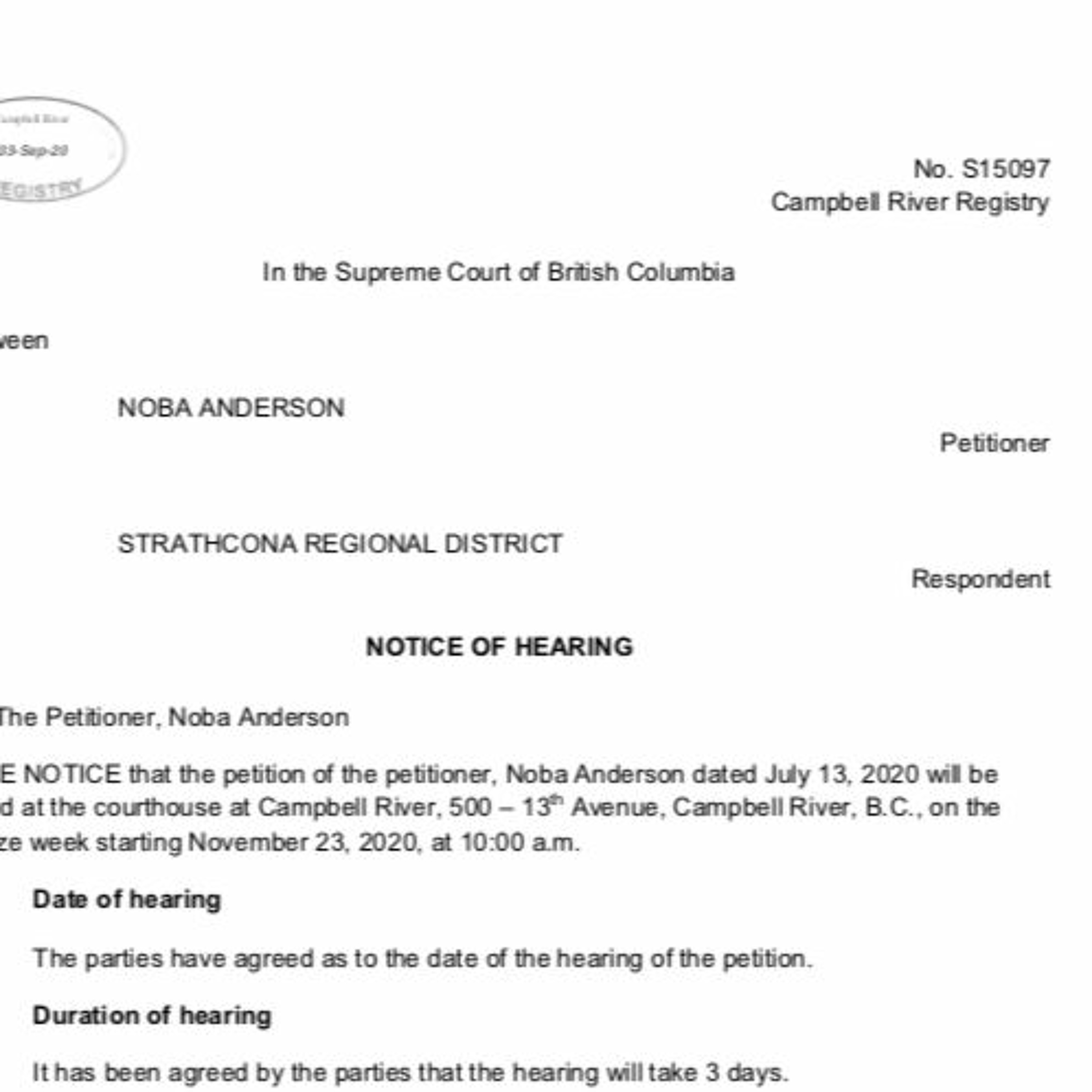 Roy L Hales/Cortes Currents - A hearing date has been set for Noba Anderson vs the Strathcona Regional District, in the Supreme Court of British Columbia courthouse at #500 – 13th Avenue, Campbell River, B.C., sometime during the assize week starting November 23, 2020.