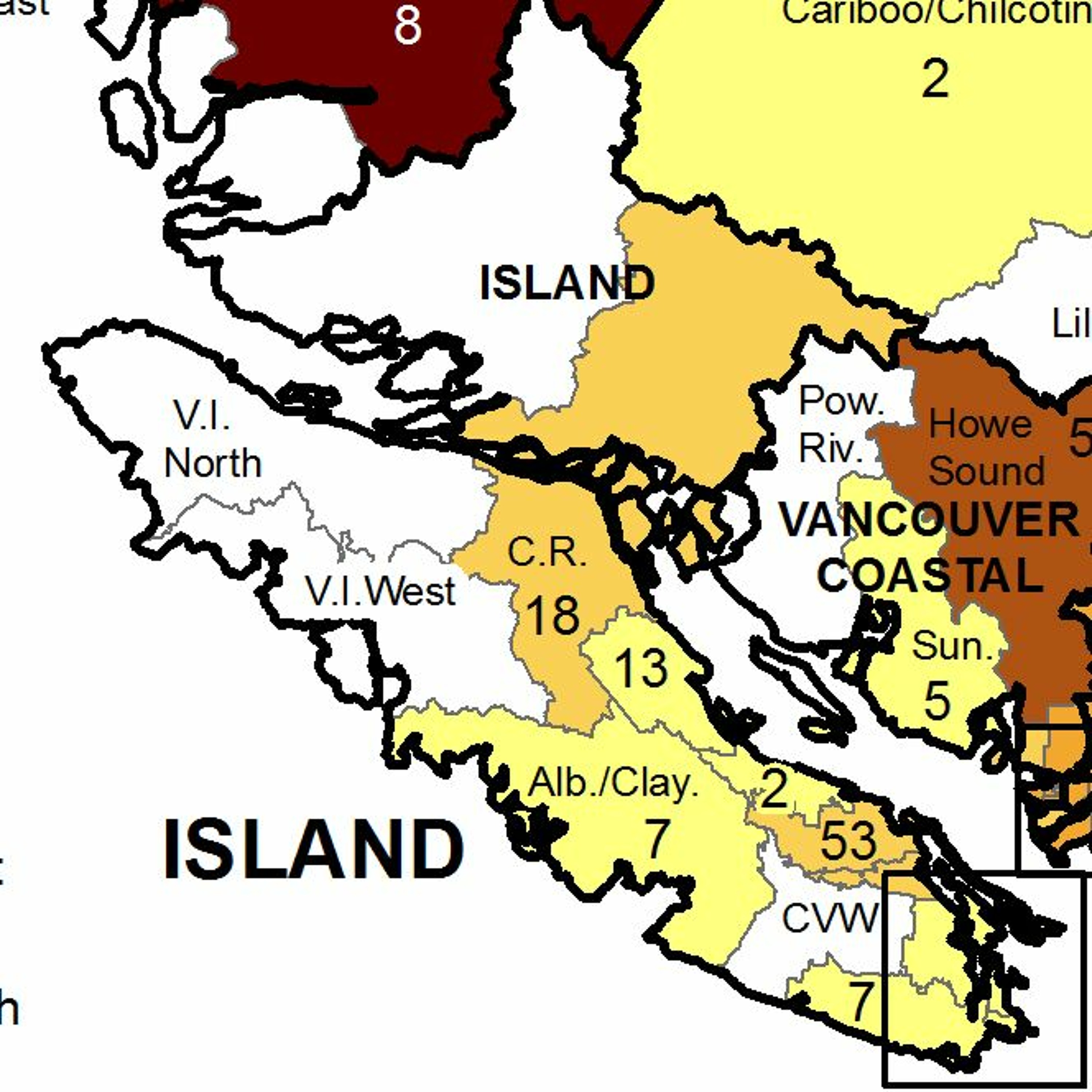More localized statistics from the BC Centre for Disease Control show that the recent surge in North Vancouver Island numbers started in the Comox Valley at the beginning of last month. By the epi-week of February 21st to 27th, there were 44 active cases. Yesterday the BC Centre for Disease Control released the statistics for the epi-week ending on Saturday March 13th. At that point there were only 13 active cases.