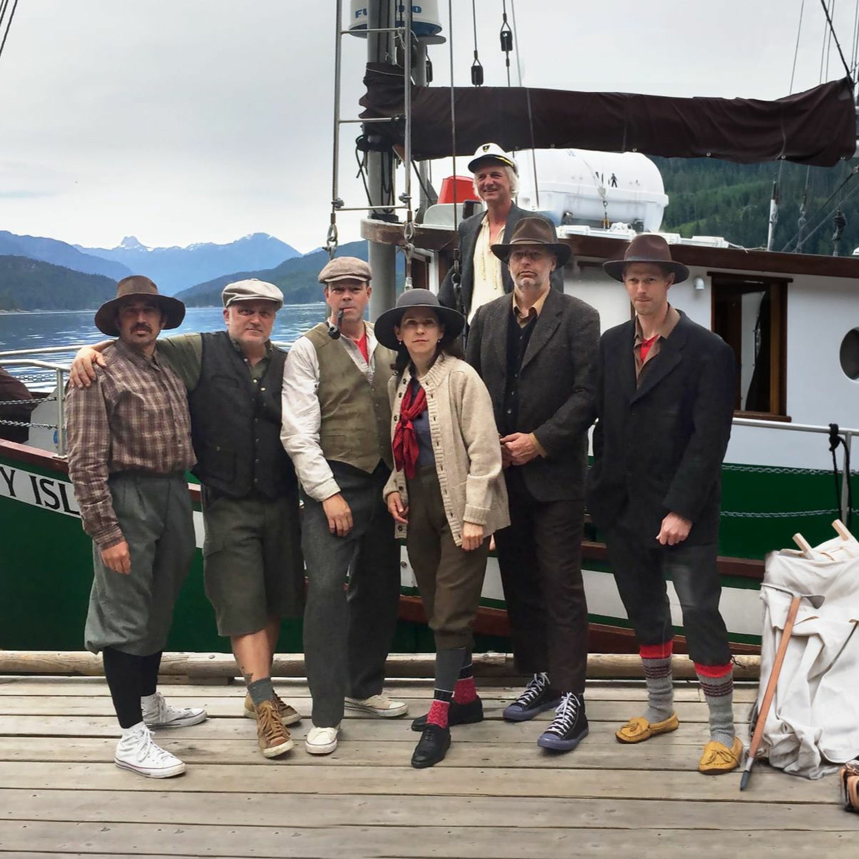The reenactors with Mike Moore in front of the Misty Isles - Photo courtesy Susanna Oreskovic