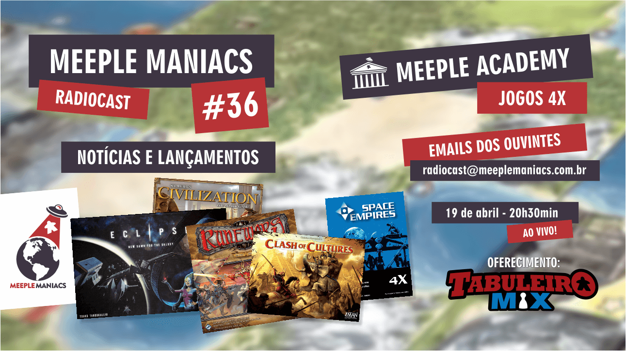 No Meeple Maniacs Radiocast desta semana confira o que Jack e Lukita jogaram, além das notícias, lançamentos do mercado e as campanhas mais recentes em financiamento coletivo. Na Meeple Academy, vamos falar de jogos 4X. Por fim, os emails dos ouvintes.