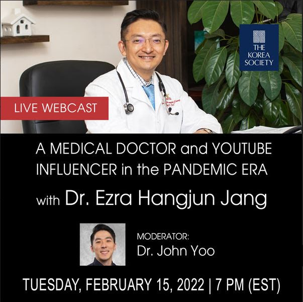 The Korea Society is excited to welcome Dr. Ezra Hangjun Jang, Internal medicine specialist and renowned host of the Youtube channel, “Dr. Ezra Hangjun Jang”. Dr. Jang has amassed a significant YouTube following with more than 525,000 subscribers, allowing for a substantial audience to learn crucial information from each of his videos.