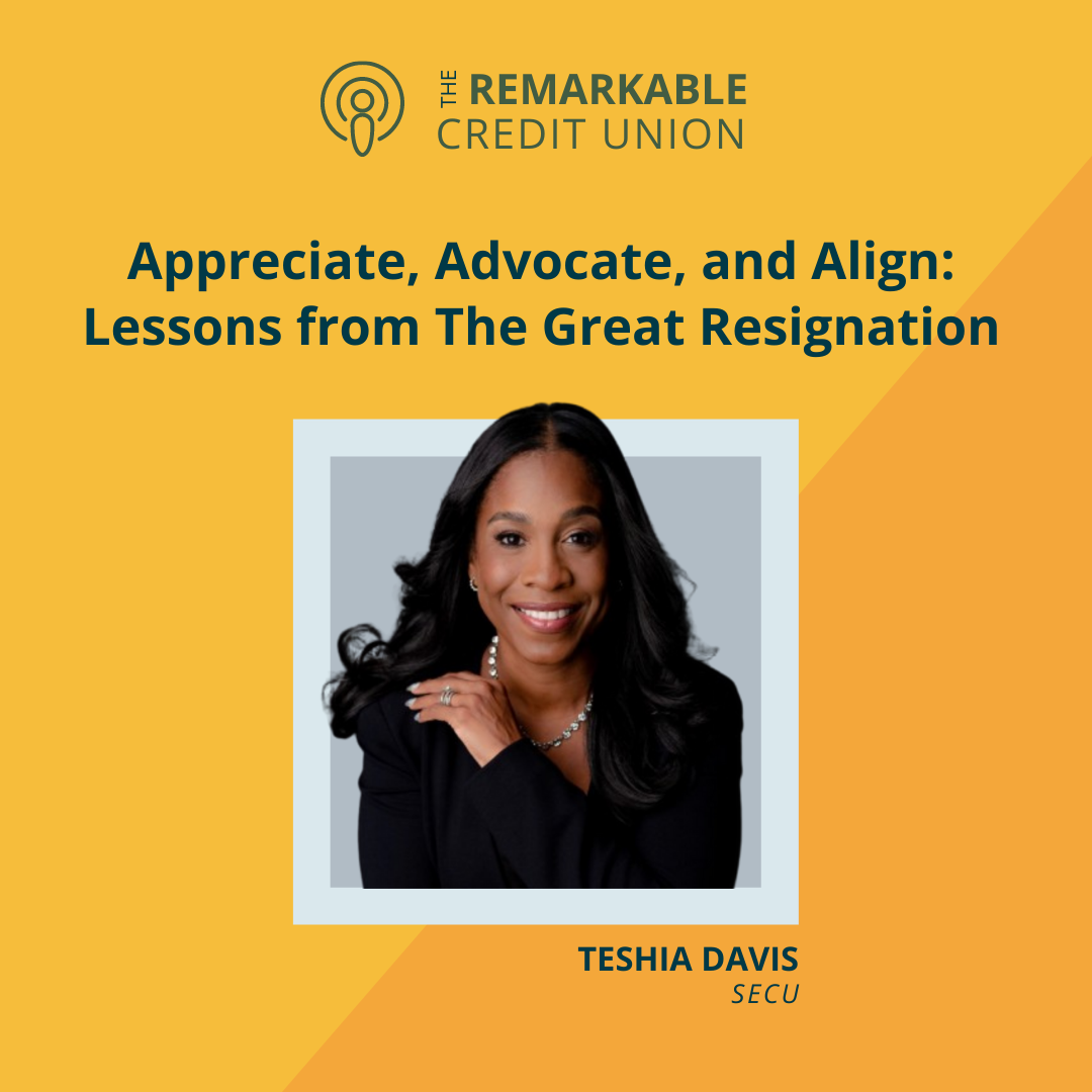 Teshia joins our Remarkable Credit Union podcast to talk about how SECU has navigated the Great Resignation by creating surprise and delight for their employees, centralizing DEI as part of their guiding credit union strategy, and closely aligning HR with the marketing team.