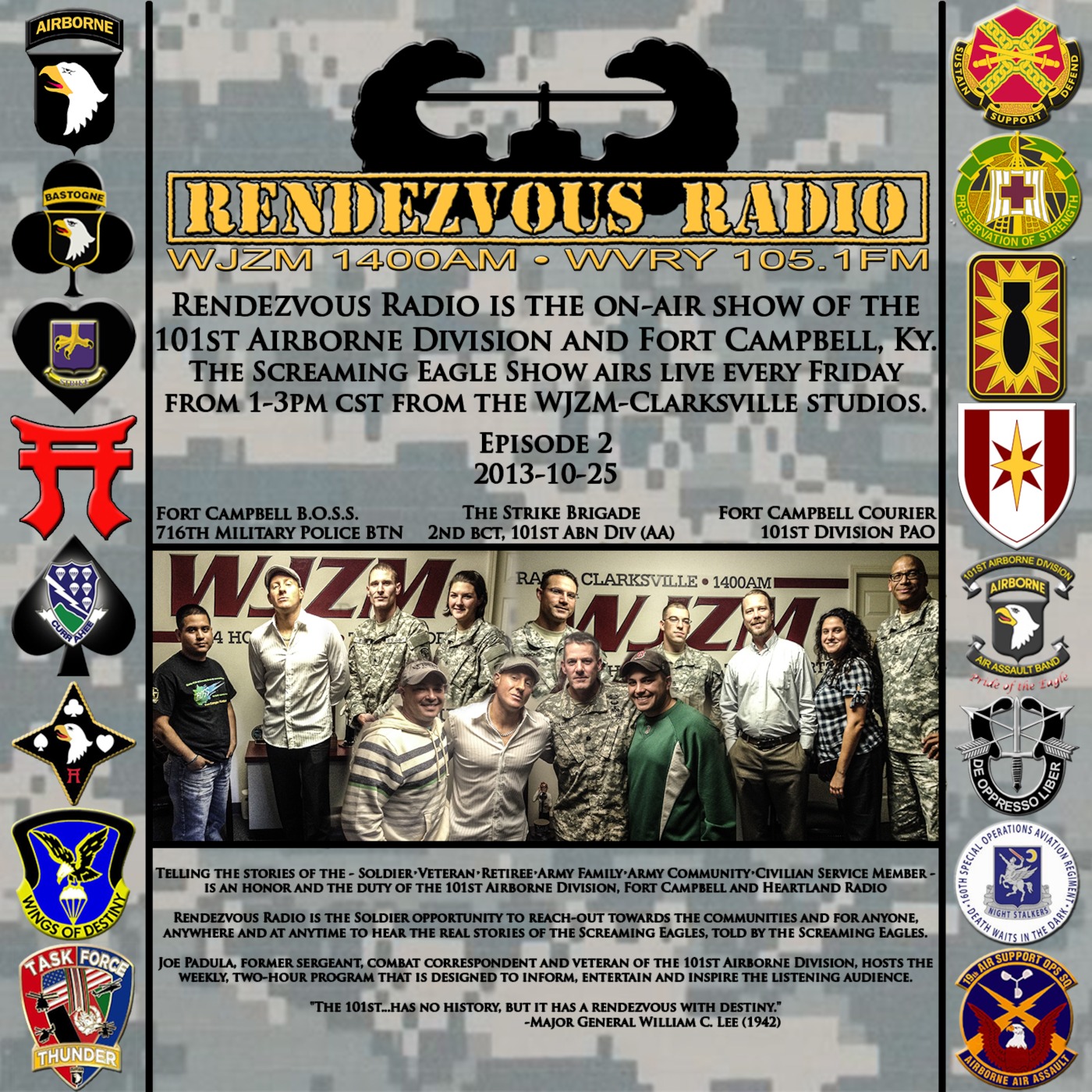 Rendezvous Radio is the on-air show of the 101st Airborne Division, Fort Campbell, WJZM 1400AM and WVRY 105.1FM.* The Screaming Eagle Show airs live every Friday from 1-3pm cst from the downtown Clarksville, Tn. studio.