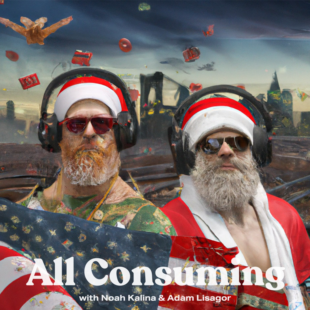 two men in dystopian Brooklyn during Christmas wearing headphones surrounded by American flags and Santa Claus flying in the sky digital art
