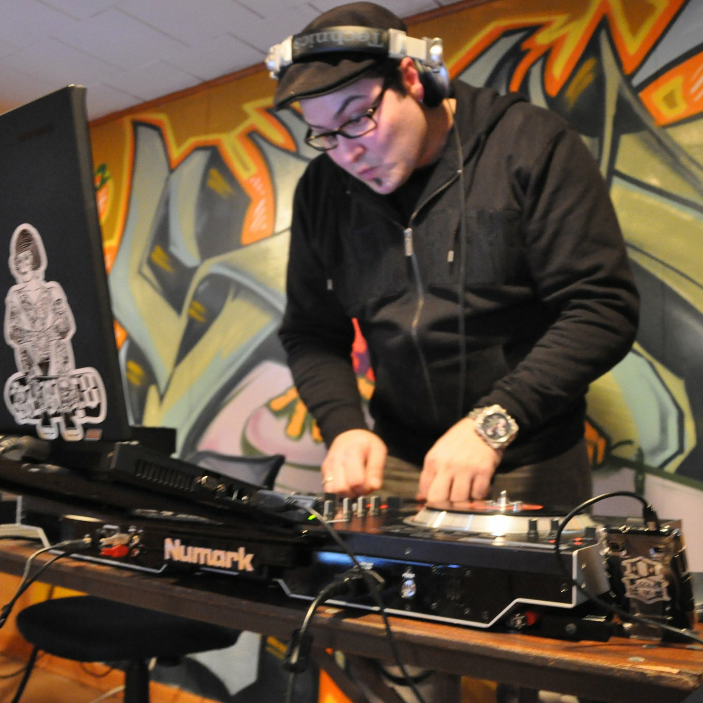 12 Intel Processors, 10 Terrabytes, 48Gb DDR3 RAM, 4GB DDR5 Video RAM, 2 Nvidia GeForce GTX 280 video processors, multiple 20″ monitors, Numark NS7 control deck with Serato/Traktor, Kenwood Vinyl mastering turntable, Numark digital mixer, 3 1080P Microsoft cameras, each system with 6GB/sec SATA SSDs, 1 Chauvet Storm RG Red/Green Laser, 1 custom Blisslight-15 high powered green starfield/purple nebula Laser, 1 Blizzard Phantasm LED/Laser hybrid starfield/ribbon green/red beam-split laser. That’s only half of it.
