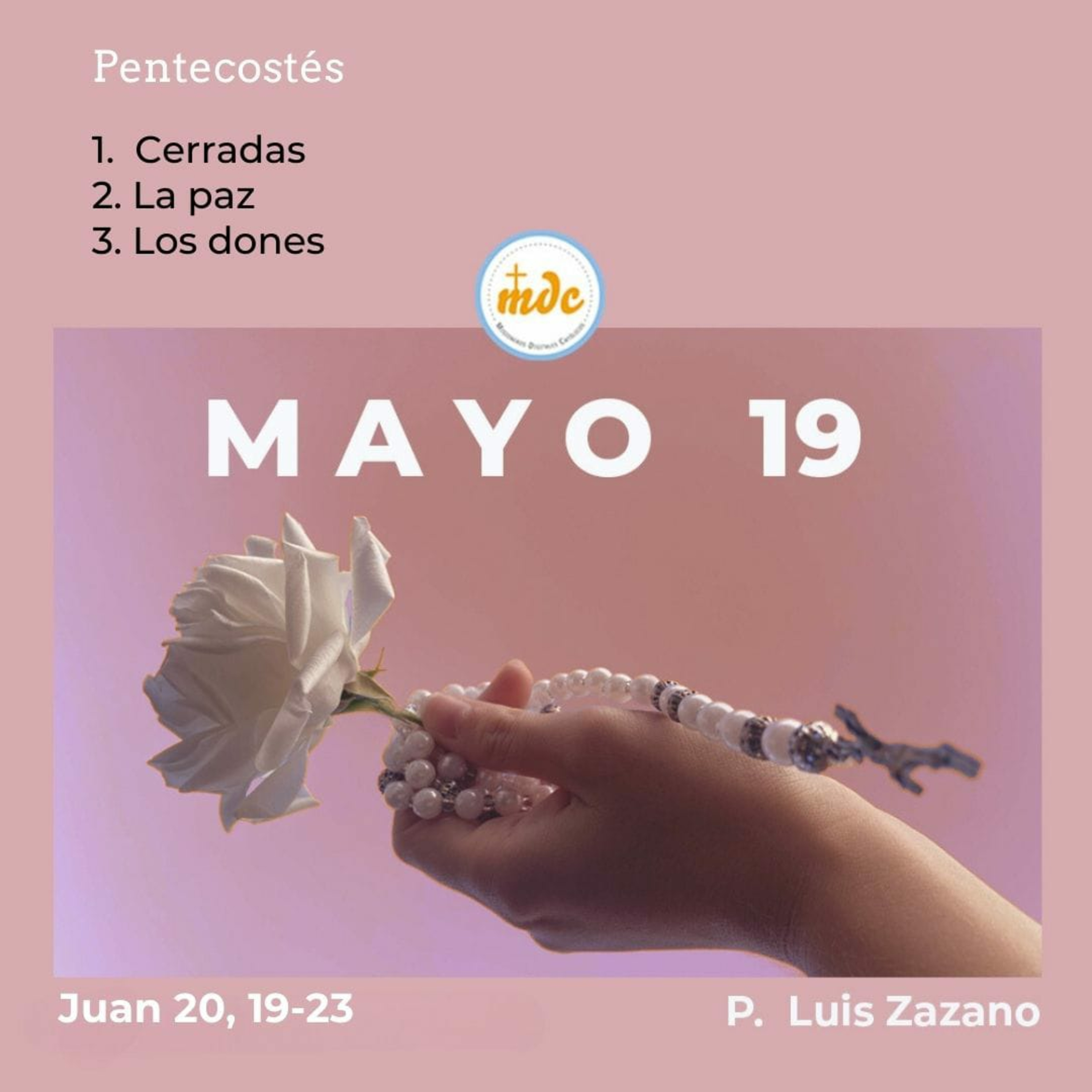 3) Los dones: Hoy pedí a Dios los siete dones. El entendimiento para entender tu vida por dónde va, el consejo para saber escuchar y no cerrarte ante los demás. La ciencia para saber decidir y tomar las decisiones y no siempre girar en opciones sin terminar de ejecutar. El don de fortaleza para ser fuerte a lo que tengas que enfrentar. El don de piedad para saber ver a Dios en todo lo que haces y en los demás. El don de sabiduría para saborear la vida y comprender lo que tienes por enfrentar. El don de temor de Dios para saber respetar todo lo que hay frente tuyo y lo que Dios quiere de vos para aportar a la vida de los demás. Hoy que en vos esté el Espíritu de Dios y en la Iglesia, para hacer de este mundo un mundo de paz y de fraternidad. Amén Algo bueno está por venir.