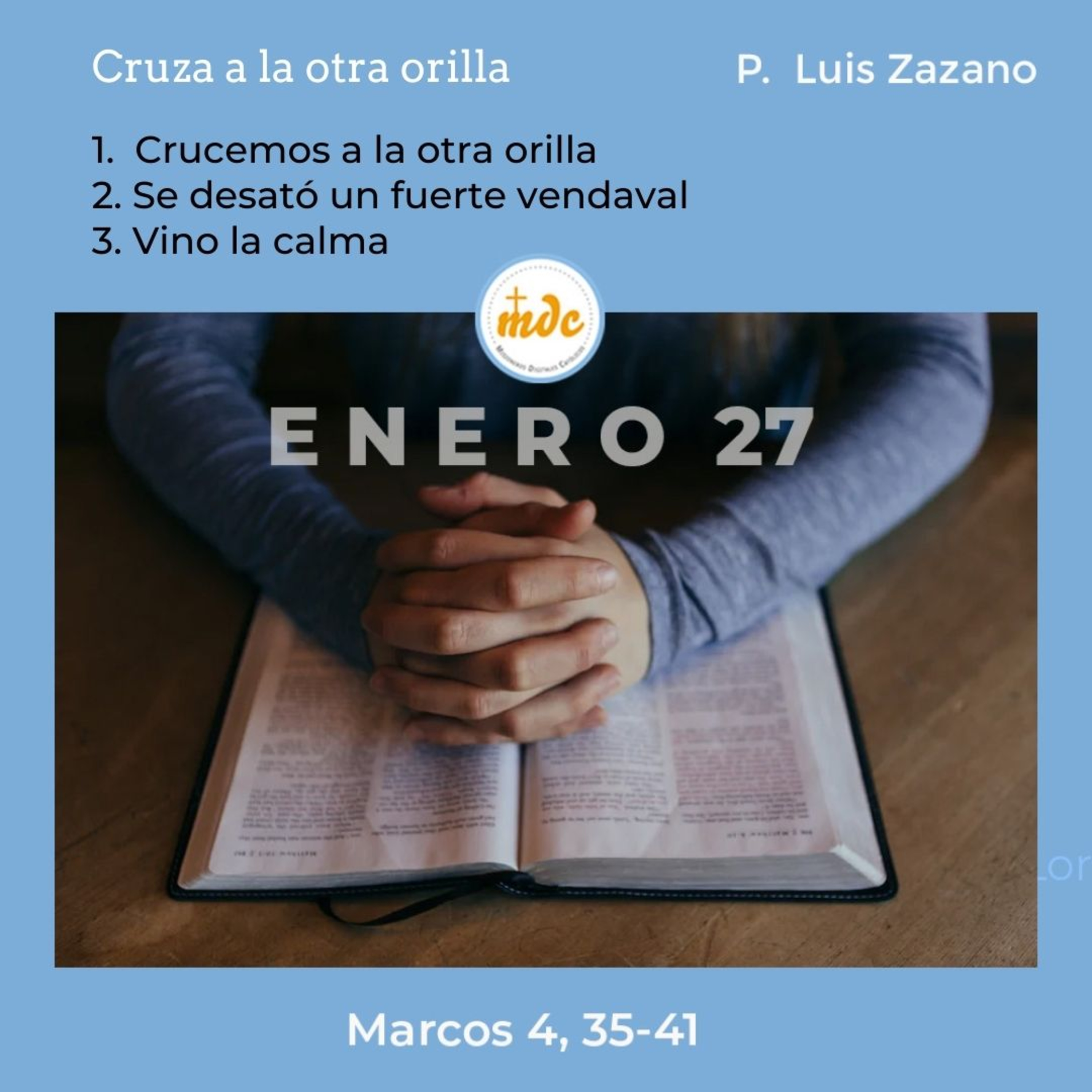 2) Se desató un fuerte vendaval: El cruzar a la otra orilla, el ir al otro, el misionar, implica también asumir riesgos, el riesgo de incluso perder la estabilidad. La evangelización también corre riesgo porque puede ahogarte y hasta hundirte. Hay que reconocer que muchos evangelizadores se ahogaron y hasta se les movió el piso, incluso algunos hasta se ahogan. El cruzar orillas puede traer crisis, incluso de pensar que Dios está dormido. Por eso el misionero cotidiano debe ser valiente, pero también prudente. No debe ser miedoso y debe confiar en la oración.