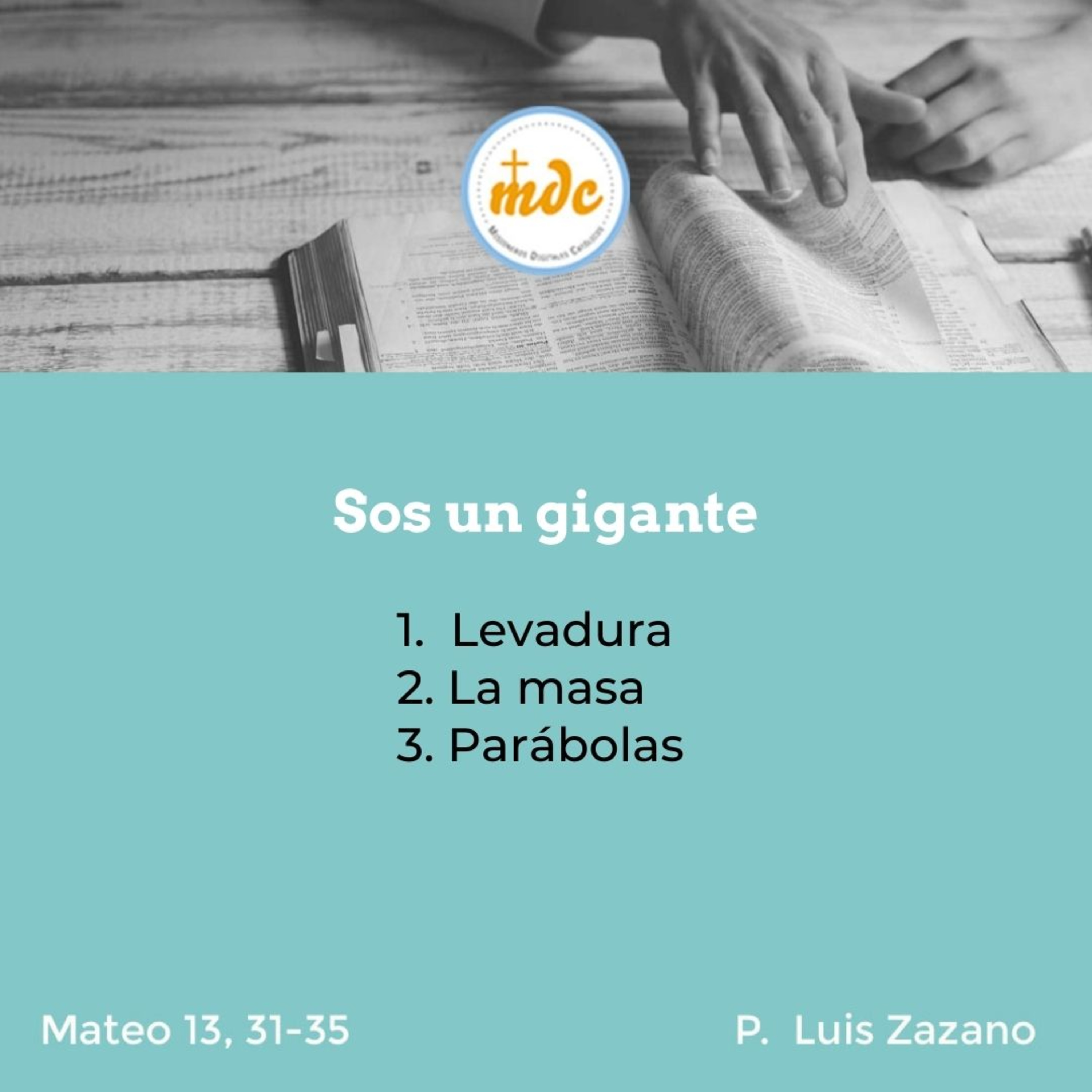 1) Levadura: no te dejes llevar por la masa o por el montón. Vos tenés una particularidad y tenés que saberla aprovechar porque es tu vida y tu vida es única. Muchos opinólogos querrán manejarte la vida, pero, cuando estés empantanado, es casi seguro que no queda ni uno. Como también una persona concreta querrá manejarte y manipularte. ¡No! Vos sos vos y tenés una misión que cumplir en la tierra en ese caminar vía al cielo. Cada día es un desafío y cada vida tiene un proceso. Vos no sos la excepción. Ánimo.