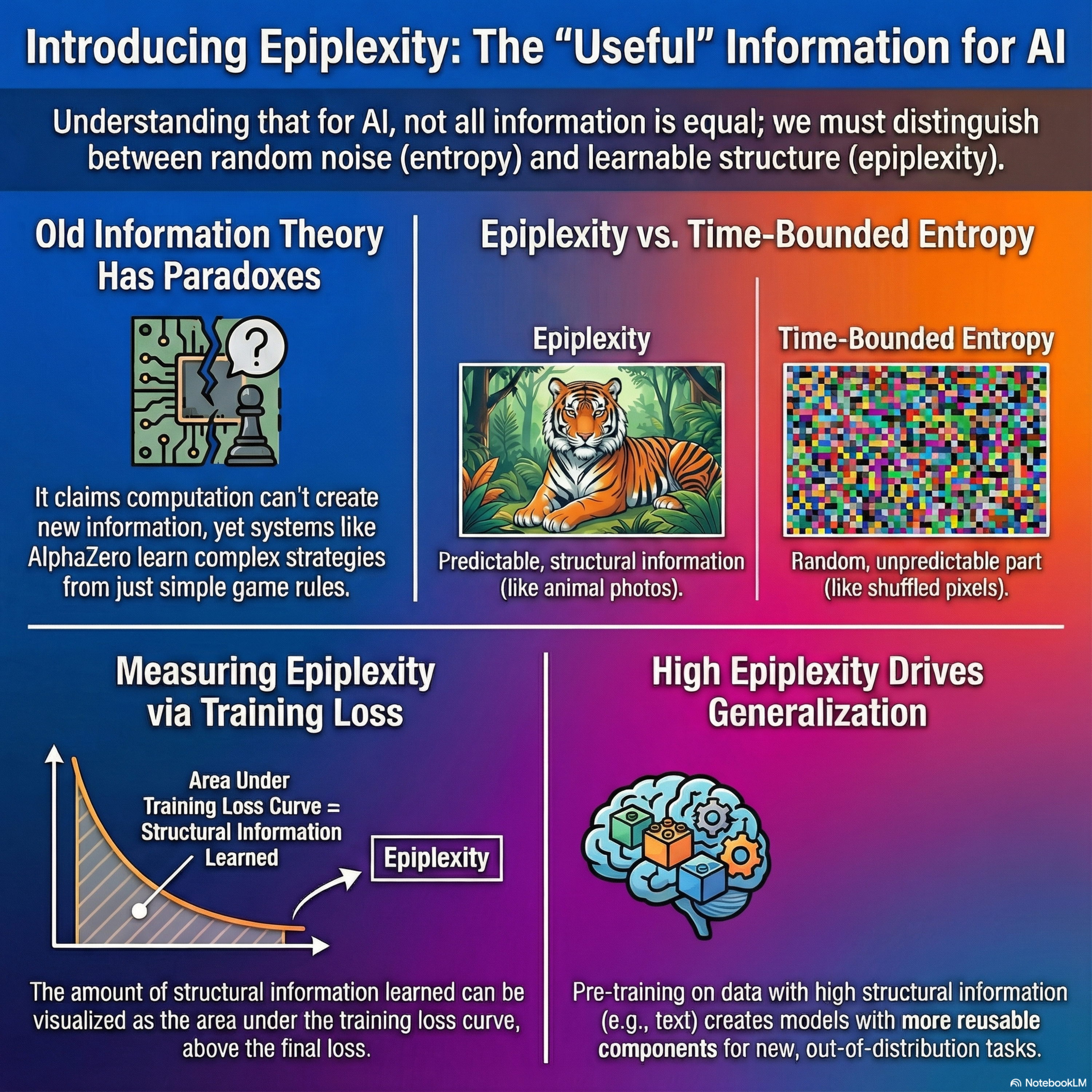 Modern AI theory often struggles to explain why certain datasets enable better out-of-distribution generalization than others, as classical information theory fails to account for computational constraints. This research introduces epiplexity, a new metric that quantifies the structural, learnable information an observer can extract within a limited time budget. Unlike standard entropy, which treats random noise and complex patterns similarly, epiplexity distinguishes reusable structure from inherent randomness. By applying this lens, the authors resolve three paradoxes regarding data ordering, deterministic transformations, and the limits of distribution matching. Their findings demonstrate that language data possesses significantly higher epiplexity than image data, explaining its superior transferability. Ultimately, the paper suggests that data selection should prioritize high-epiplexity sources to maximize the acquisition of functional, intelligent behaviors.