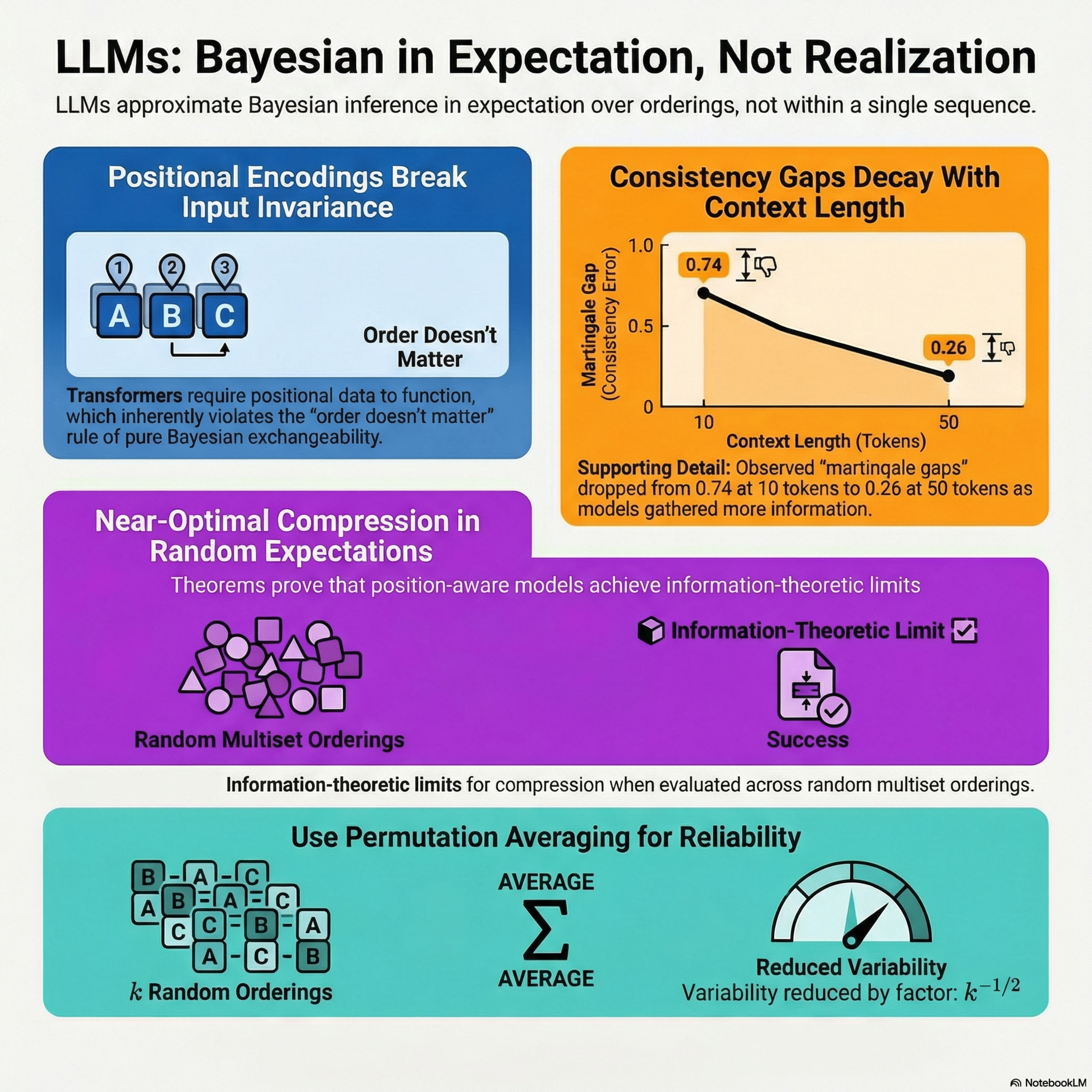 This research explores the discrepancy between transformer in-context learning and Bayesian inference, arguing that models are Bayesian in expectation rather than through every individual realization. While previous studies used martingale diagnostics to question the Bayesian nature of these models, this paper identifies positional encodings as the primary factor that breaks the required exchangeability. By accounting for how architectural design prioritizes sequence order, the authors prove that transformers still achieve near-optimal compression and information-theoretic efficiency when performance is averaged across different orderings. Empirical tests on black-box LLMs and controlled ablations demonstrate that order-induced variance exists but predictably decays as context length increases. Ultimately, the study suggests permutation averaging as a practical and effective method for reducing uncertainty and improving the reliability of model outputs in tasks with exchangeable data.