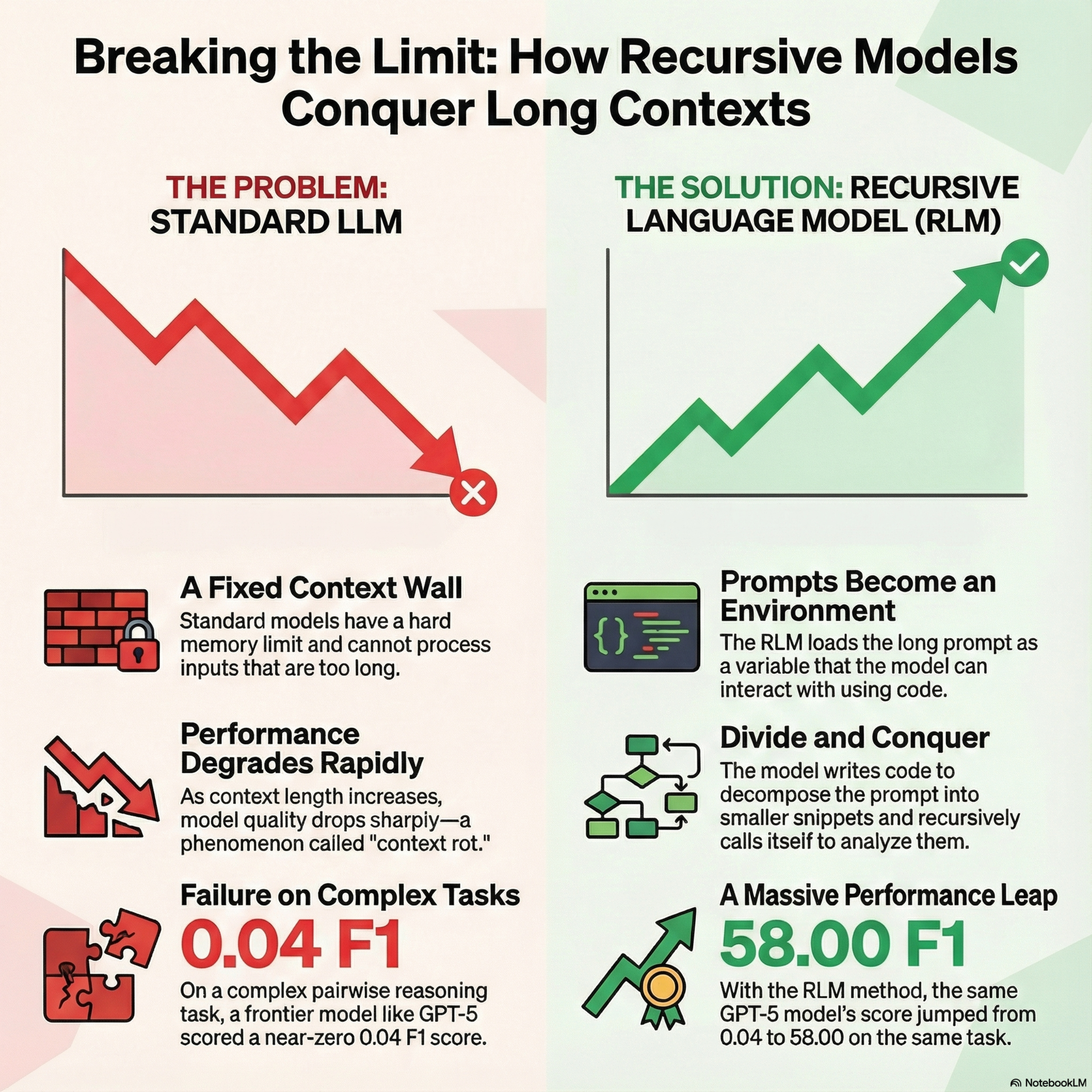 This paper introduces Recursive Language Models (RLMs), a novel inference strategy designed to overcome the limitations of context windows and the performance degradation of standard large language models. Unlike traditional approaches that feed long prompts directly into a neural network, an RLM treats the input as an external environment within a Python REPL. This allows the model to use code to programmatically examine, decompose, and filter massive datasets that would otherwise exceed its memory capacity. By recursively calling itself on smaller, manageable snippets of the prompt, the system can handle inputs up to two orders of magnitude larger than standard limits. Experimental results using frontier models like GPT-5 show that RLMs significantly outperform existing methods on complex, information-dense tasks while maintaining comparable costs. Ultimately, this framework provides a scalable way for AI to process millions of tokens without losing the fine-grained reasoning capabilities required for deep research and data aggregation.