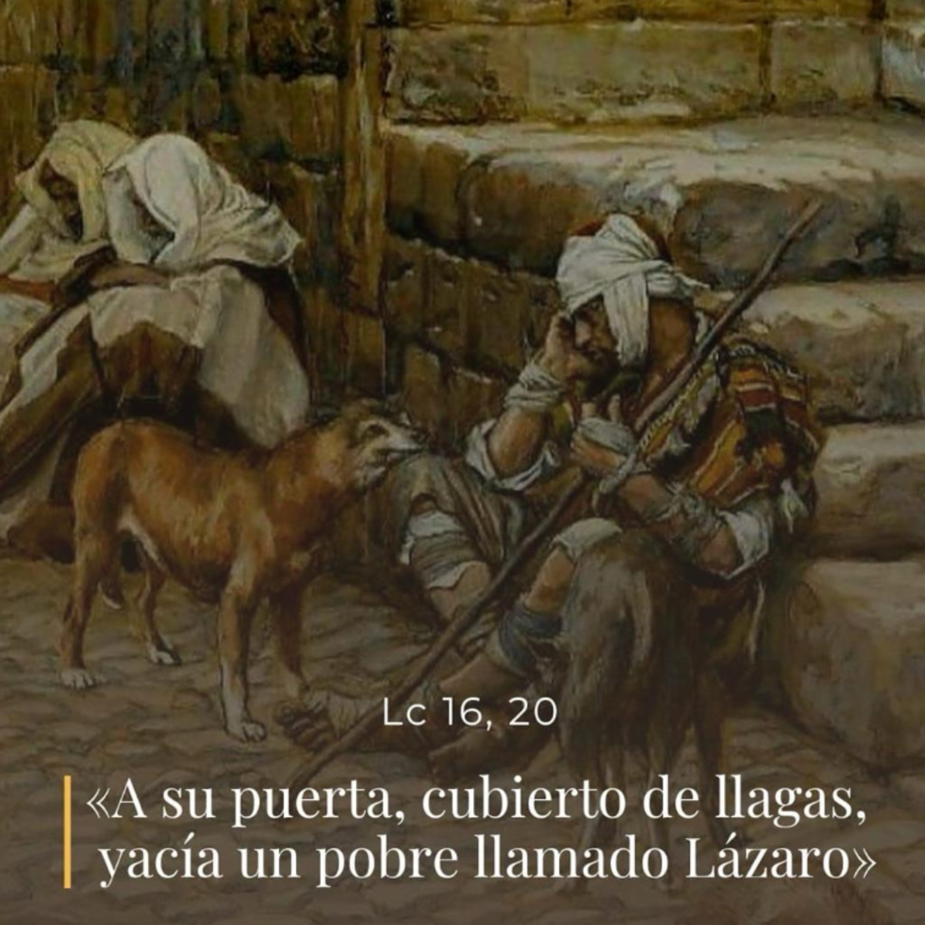 Había un hombre rico que se vestía de púrpura y lino finísimo y cada día hacía espléndidos banquetes. A su puerta, cubierto de llagas, yacía un pobre llamado Lázaro, que ansiaba saciarse con lo que caía de la mesa del rico; y hasta los perros iban a lamer sus llagas.