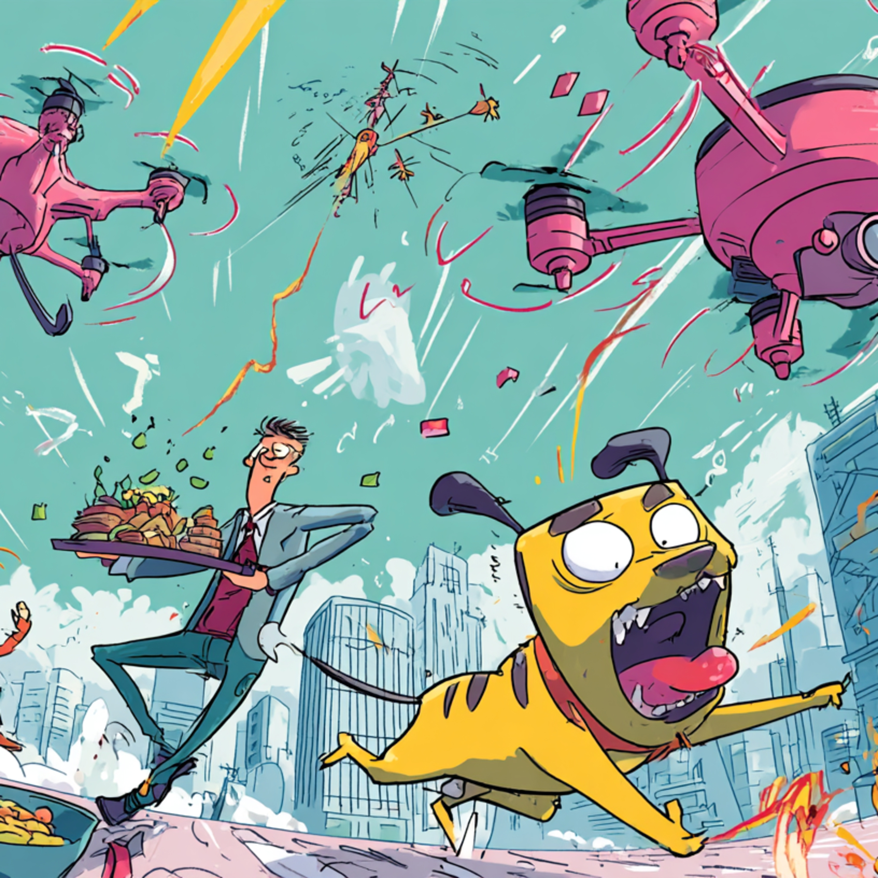 3. 丈母娘不信任阿聰,自己戴著VR眼鏡、緊張操作無人機。丈母娘手忙腳亂、按錯按鈕;無人機失控急速下墜。老丈人散步中仰頭驚恐,無人機直直砸中老丈人的頭。丈母娘叫道:「咦?怎麼不受控制?」
