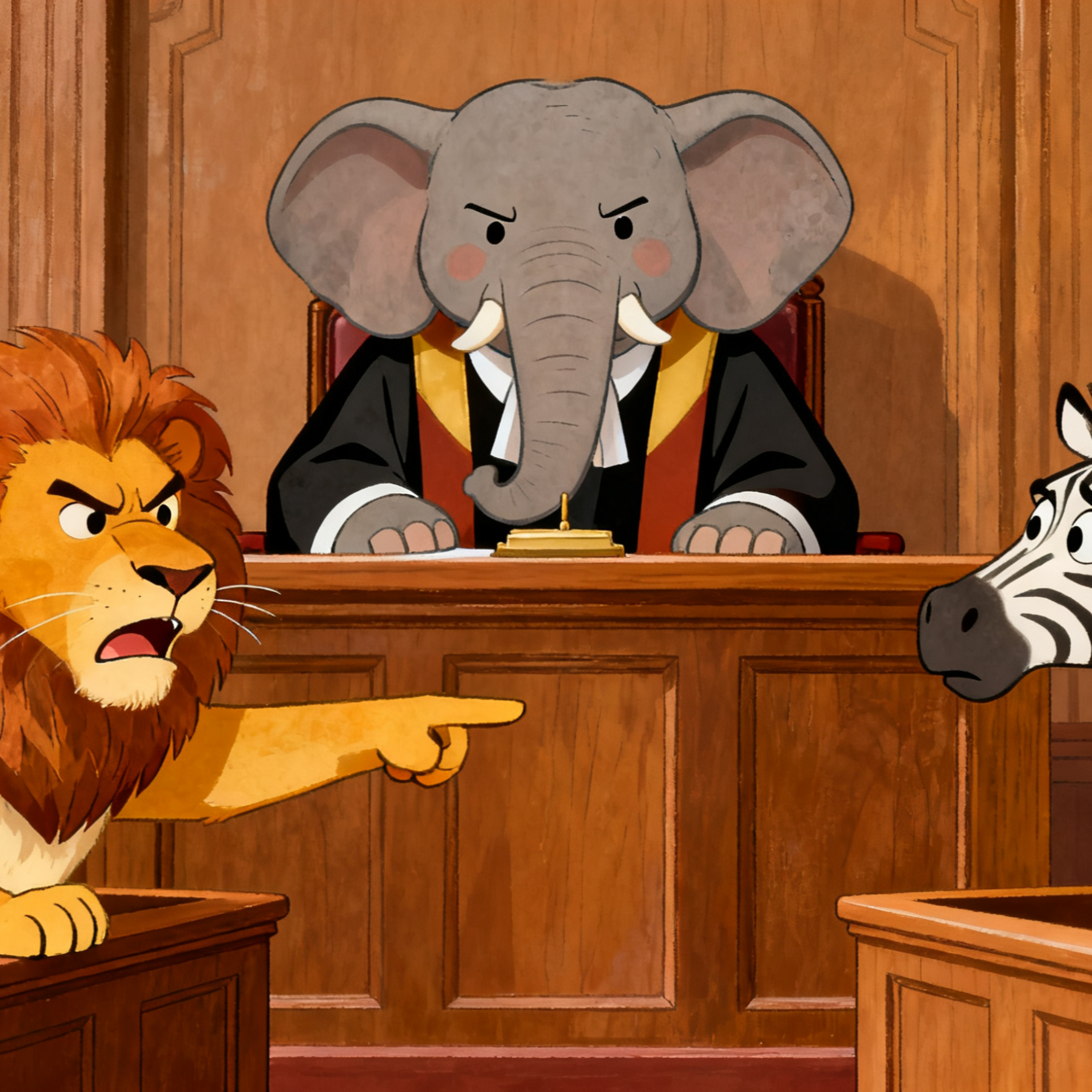 4.當斑馬準備答辯時,大象法官竟然沒問牠任何問題,就立刻莊嚴地敲下法槌,大聲判決:斑馬傷害獅子罪名成立!