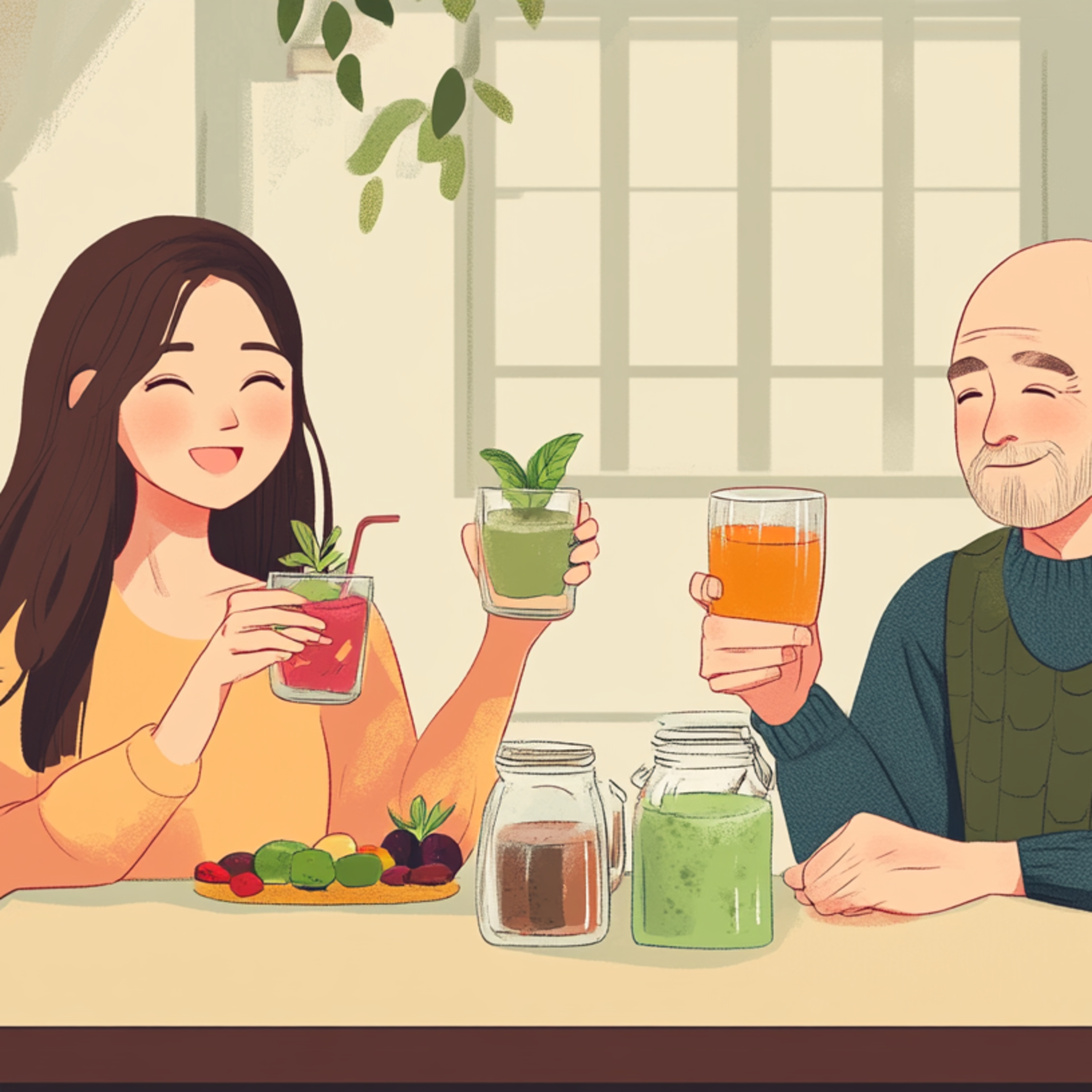 2.年邁老公拿著一杯深色青草茶,淡定地對年輕妻子搖頭,背景出現蜂蜜罐與草藥圖案。