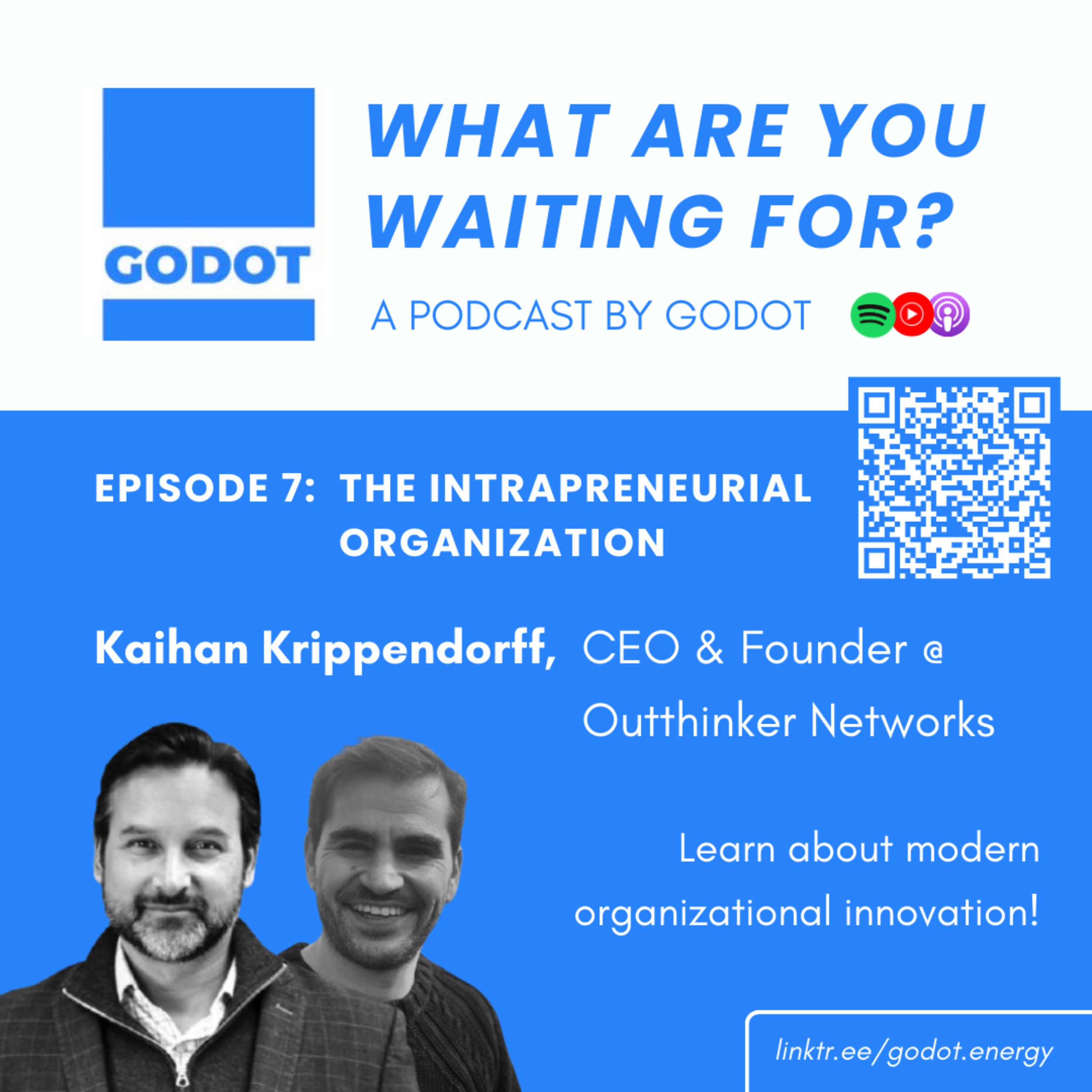 In this episode of What Are You Waiting For? By GODOT?, GODOT Founder & CEO Andy Weinstein speaks with Kaihan Krippendorff—author, speaker, and Founder & CEO of Outthinker Networks, a peer network for Chief Strategy Officers and Chief Innovation Officers at Fortune 500 companies. Together, they explore how modern organizations can become more innovative, efficient, and human-centered by embracing intrapreneurship, modularity, and decentralized leadership.