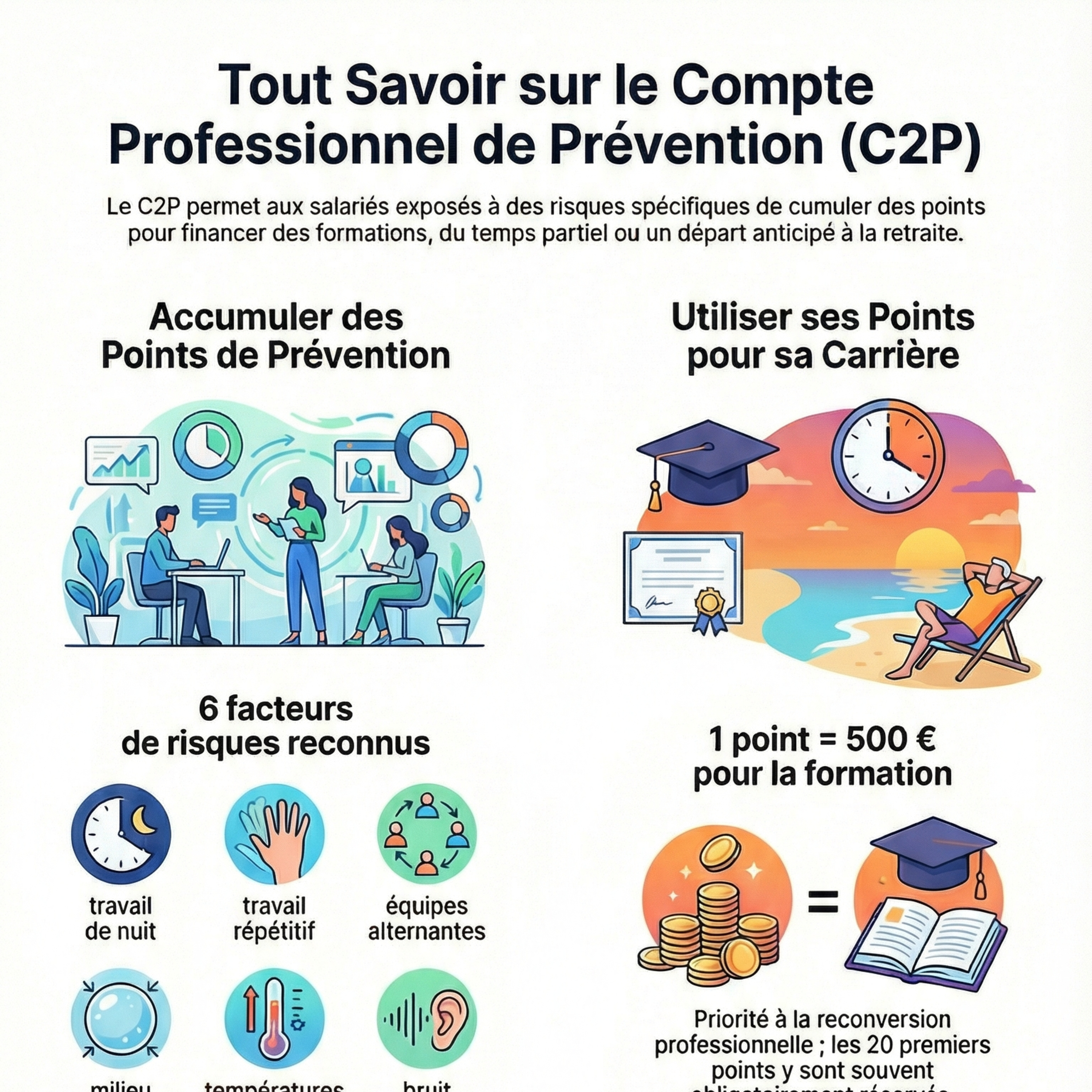 Podcast sur le C2P permet aux salariés exposés à des risques professionnels de cumuler des points. Ces points financent une reconversion, un temps partiel ou une retraite anticipée. L'employeur déclare l'exposition via la DSN, avec un plafond de 100 points pour protéger la santé.