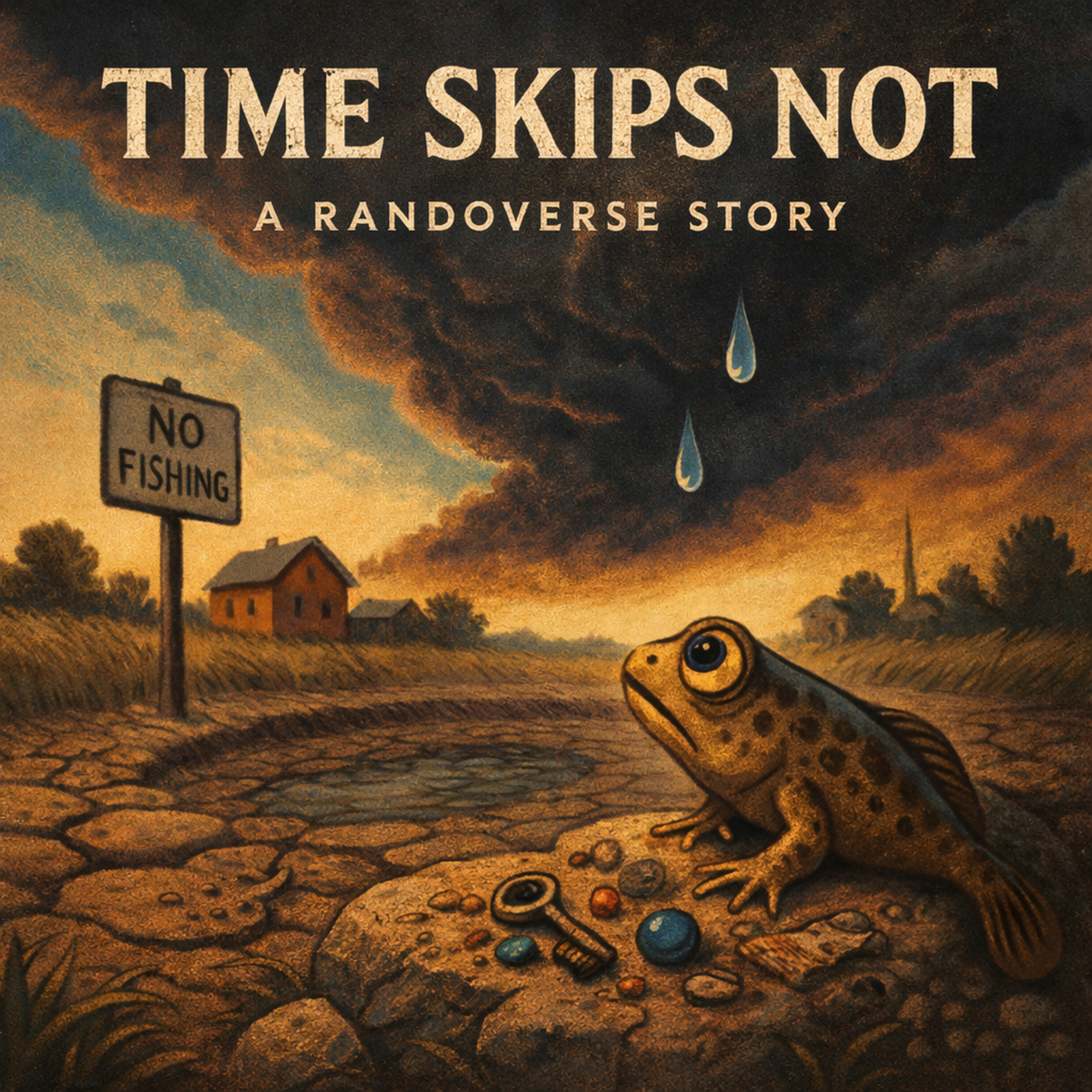 At the rim of the dry pond sits a small figure who feels something familiar returning as a storm gathers in the distance. A pull toward a life it can almost remember.