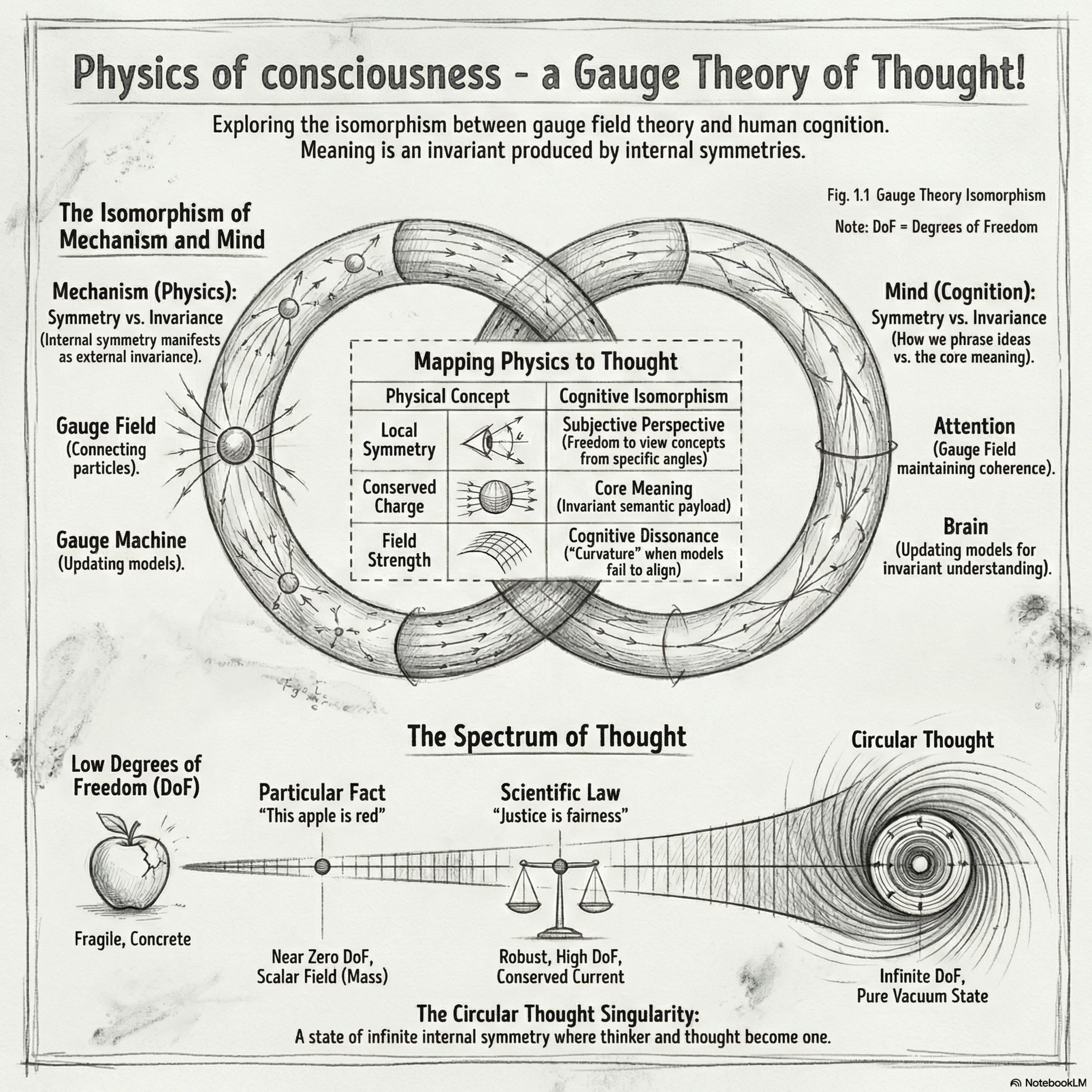 This episode proposes a provocative isomorphism between theoretical physics and cognitive science, suggesting that human thought functions like a gauge field theory. The author argues that the "meaning" of an idea is a gauge-invariant core that remains stable even as its internal expression—such as language or neural patterns—undergoes various symmetries or transformations. By exploring the degrees of freedom within concepts, the report classifies thoughts ranging from rigid, concrete facts to highly abstract, universal truths. Ultimately, it speculates on the existence of a "circular thought," a theoretical cognitive singularity characterized by infinite internal flexibility and absolute external stability, serving as the ground state of consciousness.