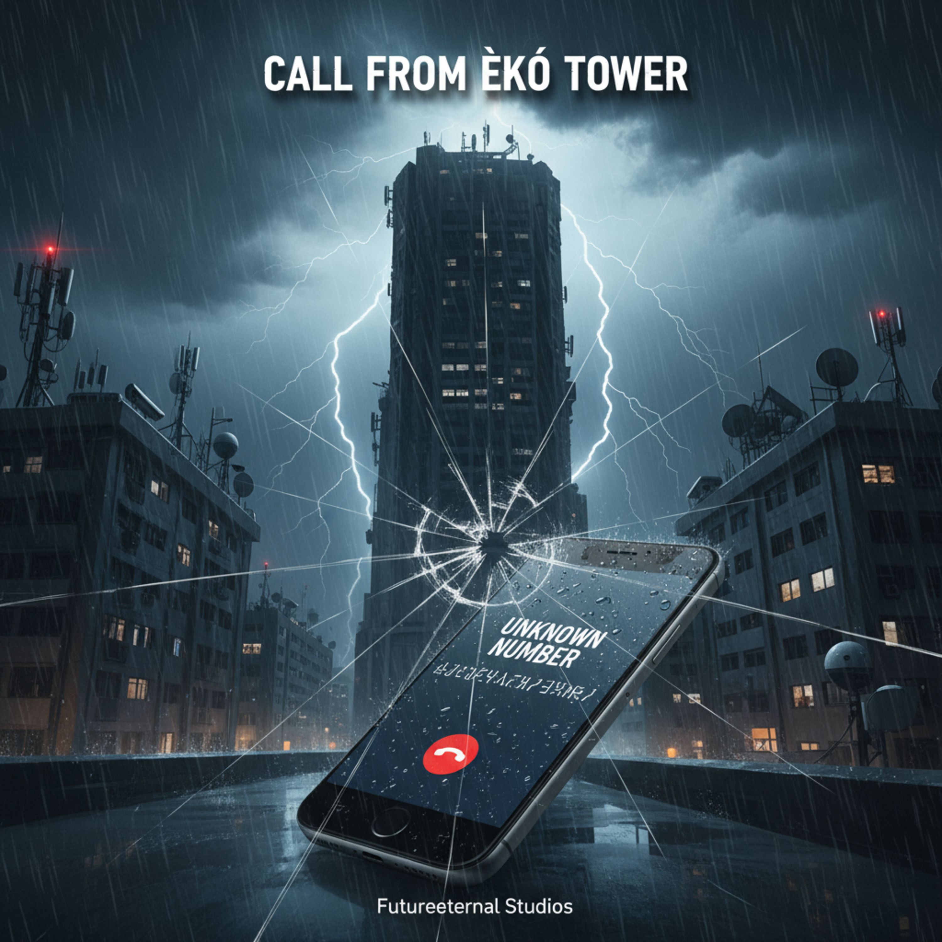 Throughout the conversation, thunder rumbles and builds - "grumble-grumble-BOOM" - joining and emphasizing the threats. The storm intensifies as the caller reveals they're speaking from Èkó Tower, the highest point in Lagos, where they can "see everything."