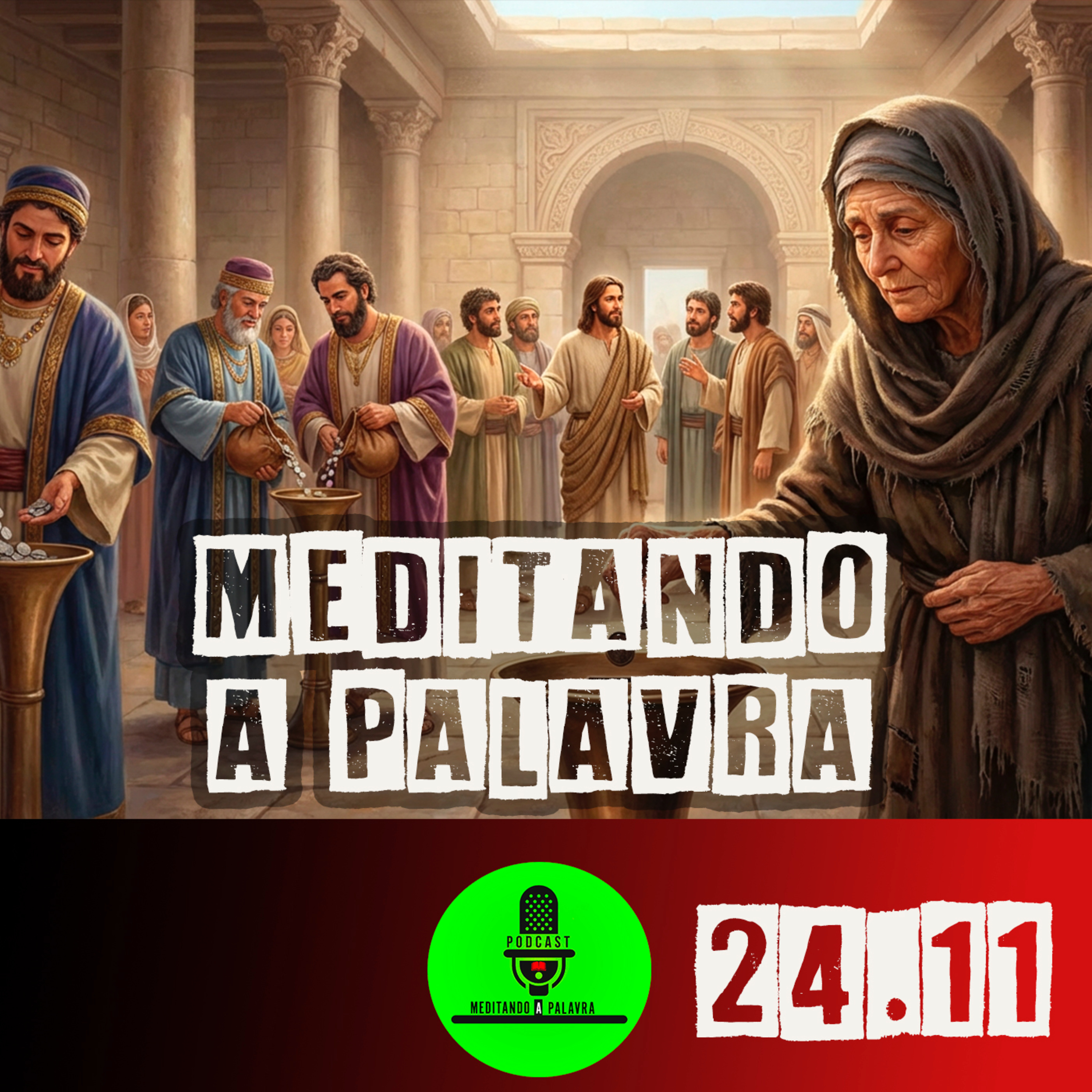 Jesus observa as pessoas depositando suas ofertas no tesouro do templo. Muitos ricos colocam grandes quantias. Então uma pobre viúva se aproxima e deposita duas pequenas moedas. Jesus então declara aos discípulos que aquela viúva deu mais do que todos, pois ofereceu tudo o que tinha para viver.