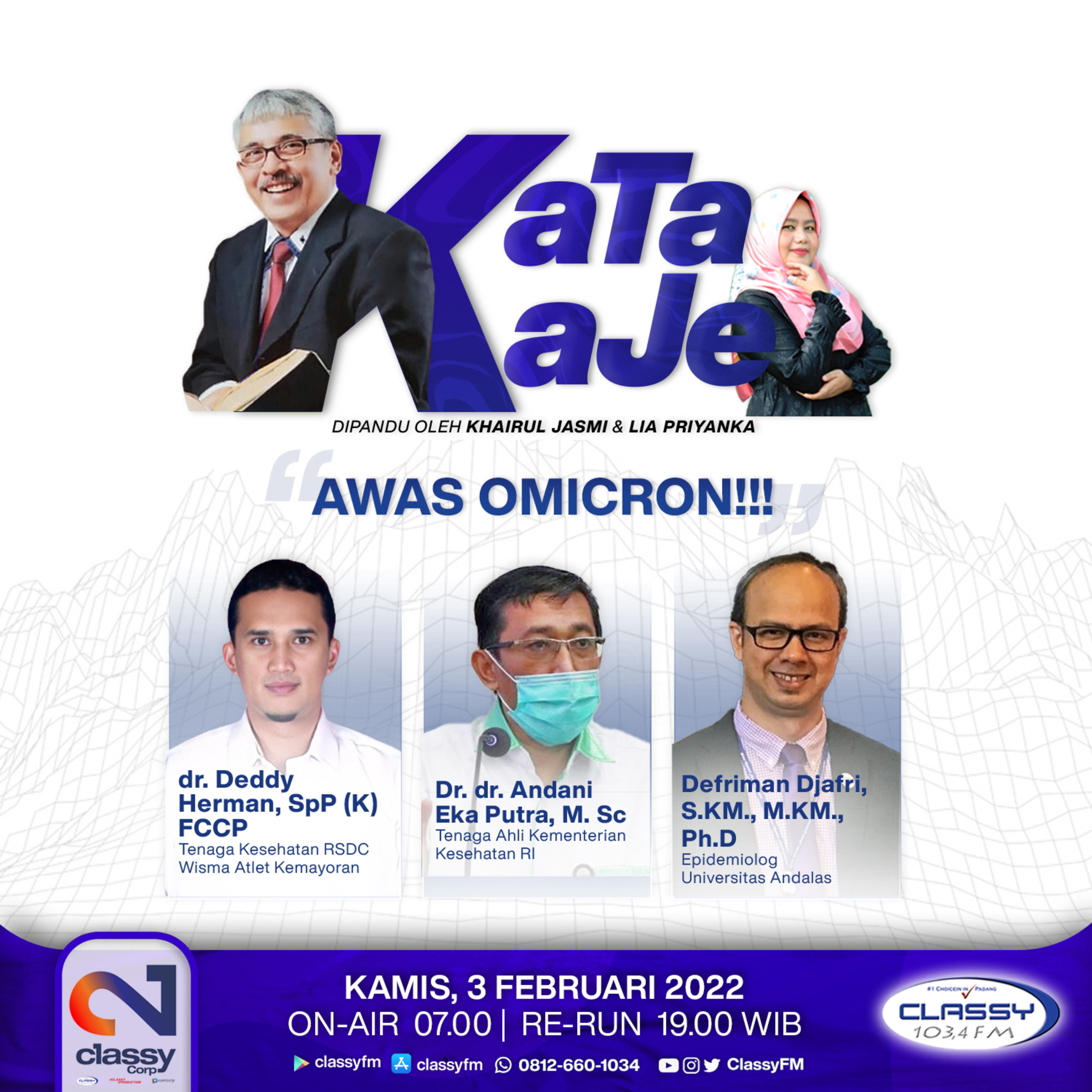 Program Kata Kaje pada Kamis, 3 Februari 2022 hadir bersama Khairul Jasmi (Kaje), seorang wartawan senior, bersama Classier Lia Priyanka yang membahas mengenai bahaya varian Omicron bersama nara sumber yang profesional