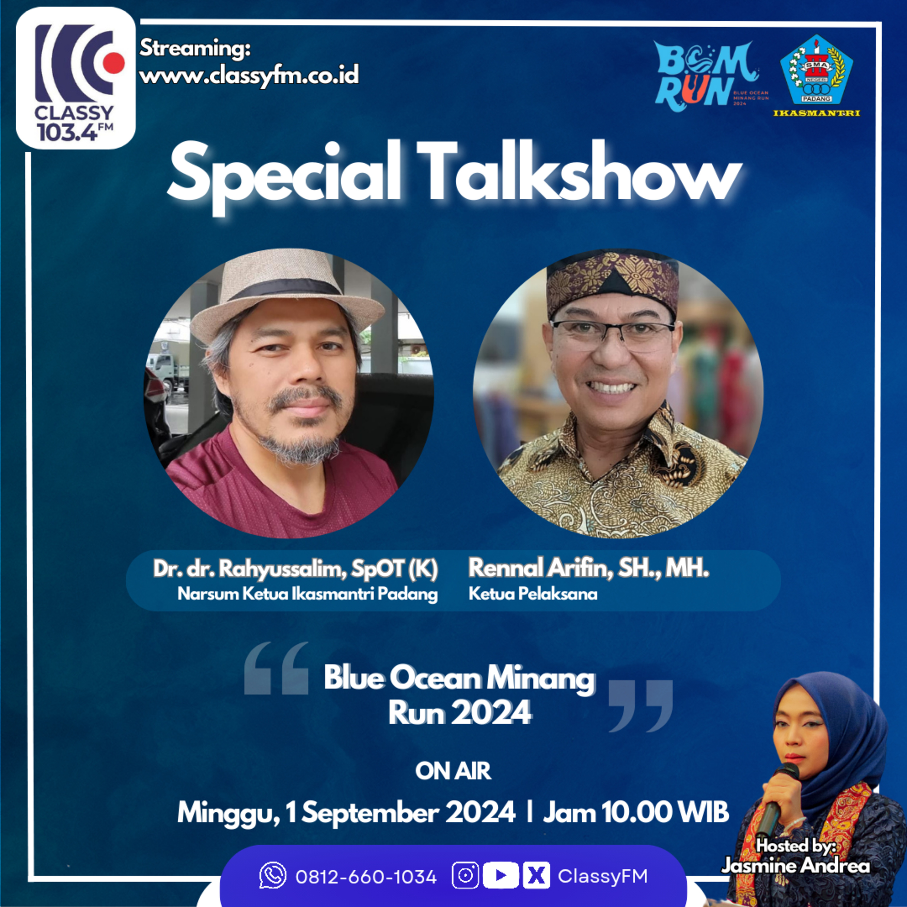 Special Talkshow menghadirkan Renal Arifin, SH., MH. dan Dr. dr. Rahyussalim, SpOT (K) sebagai Ketua Pelaksana dan Ketua Ikasmantri Padang yang membahas tentang event Ikasmantri Padang, Blue Ocean Minang Run 2024.