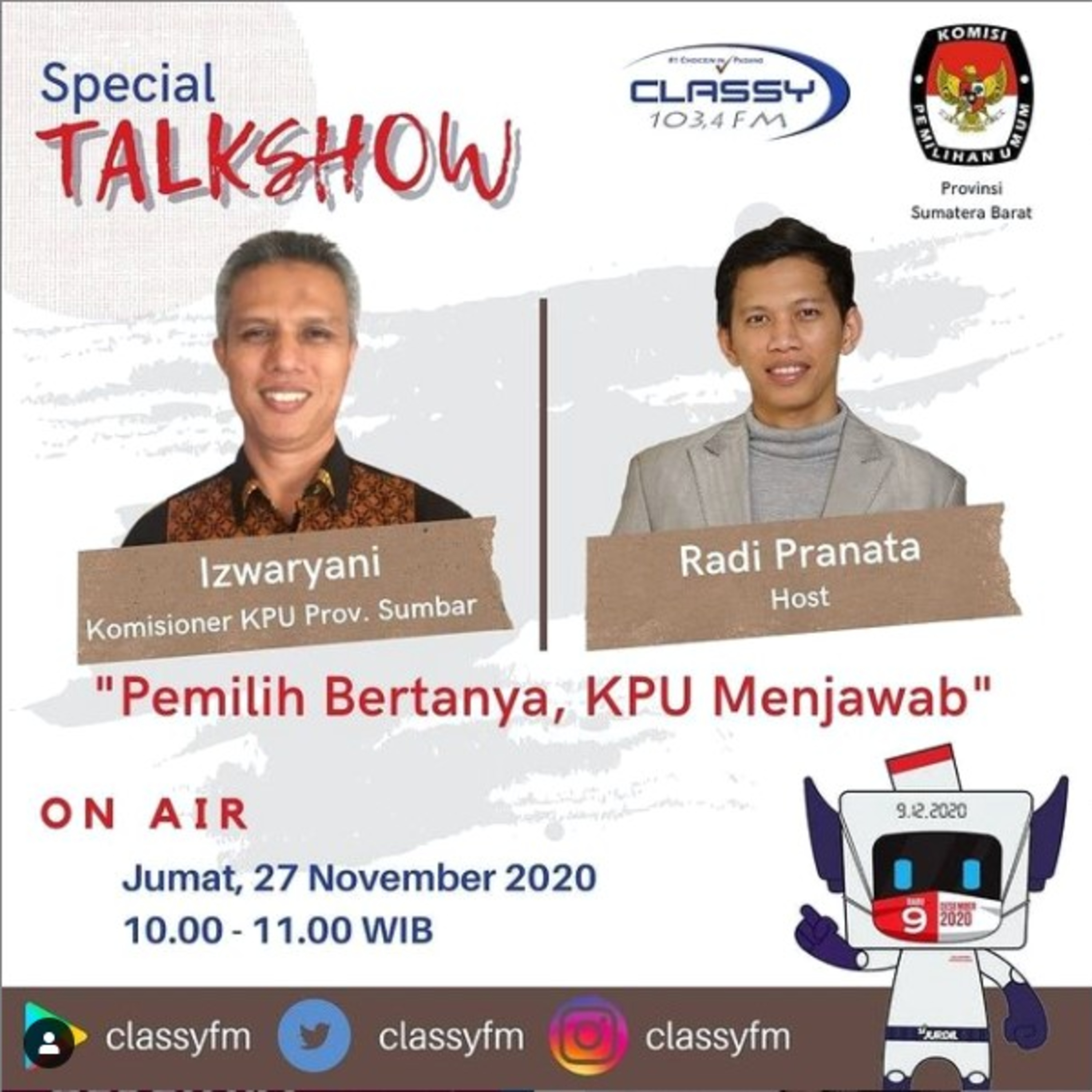 Special Talkshow hadir bersama KPU Sumatera Barat untuk menjawab pertanyaan-pertanyaan yang sering muncul di tengah masyarakat mengenai pelaksanaan Pemilihan Kepala Daerah 2020 yang akan dilaksanakan pada 09 Desember 2020.