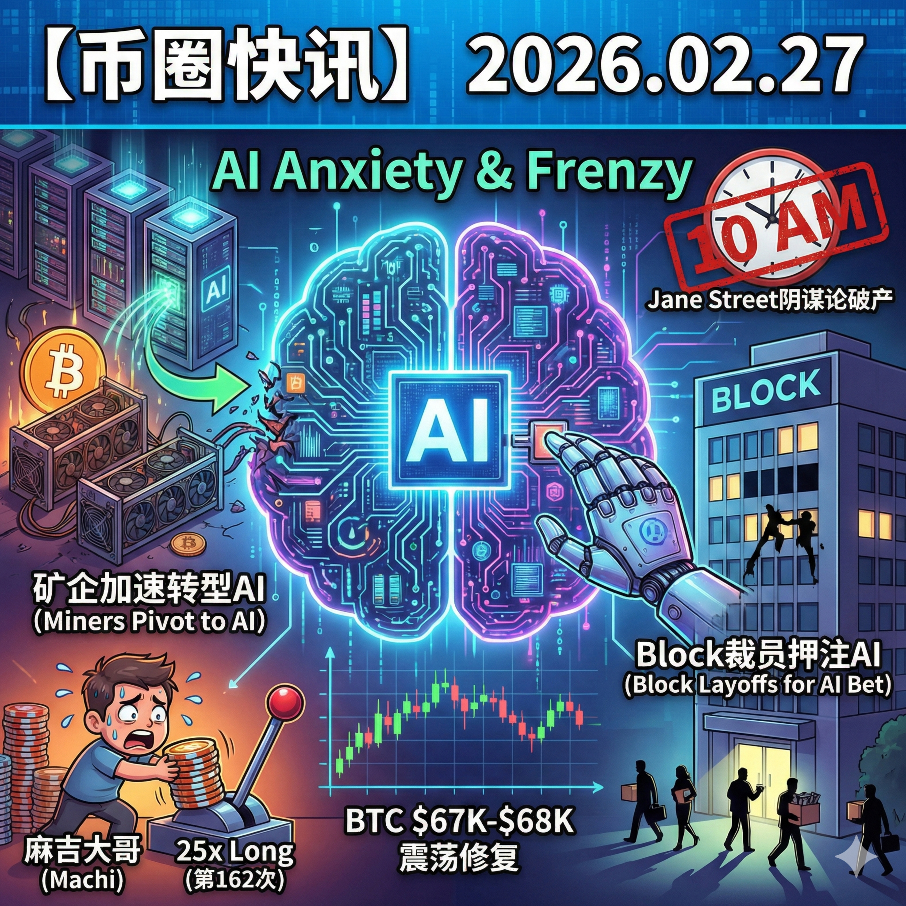 今天是 2026 年 2 月 27 日。加密市场在经历连日恐慌后迎来了喘息,比特币围绕 6.7 万至 6.8 万美元区间震荡修复。今日市场的最大主线是**“AI 焦虑与狂热”**——支付巨头 Block 宣布裁员近半全面押注 AI,多家头部比特币矿企加速向 AI 数据中心转型。与此同时,被社区炒得沸沸扬扬的“Jane Street 10点砸盘”阴谋论遭到了多位业内大佬和数据机构的集体反驳。
