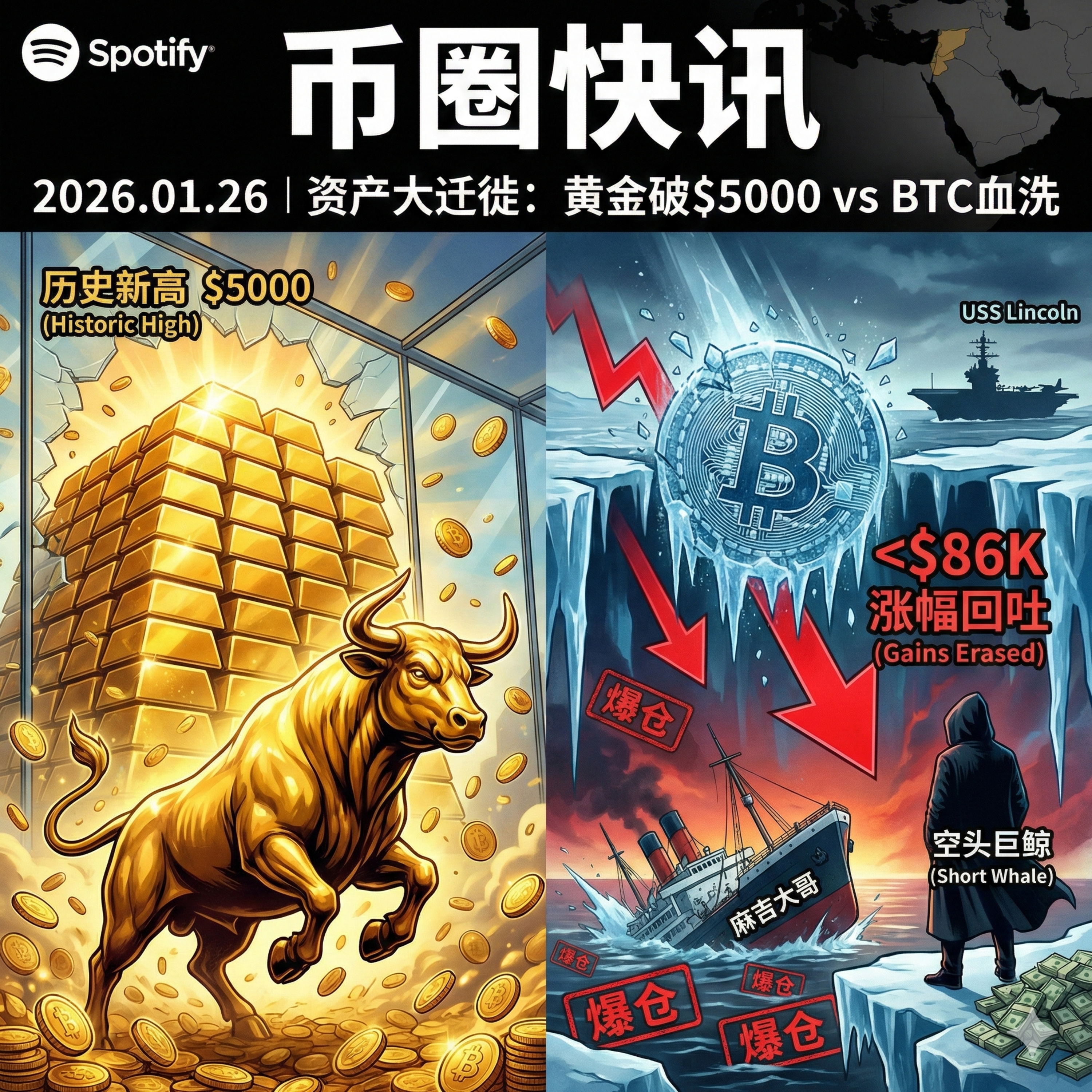 今天是 2026 年 1 月 26 日。如果说前几天是宏观预警,那么今天就是实打实的“资产大迁徙”。全球避险情绪达到顶峰,现货黄金历史上首次突破 5000 美元大关,而比特币则遭遇了残酷的抛售,回吐了 1 月份的所有涨幅。链上世界更是惨烈,“麻吉大哥”的千万美元多单再次灰飞烟灭,而空头巨鲸则迎来了狂欢。