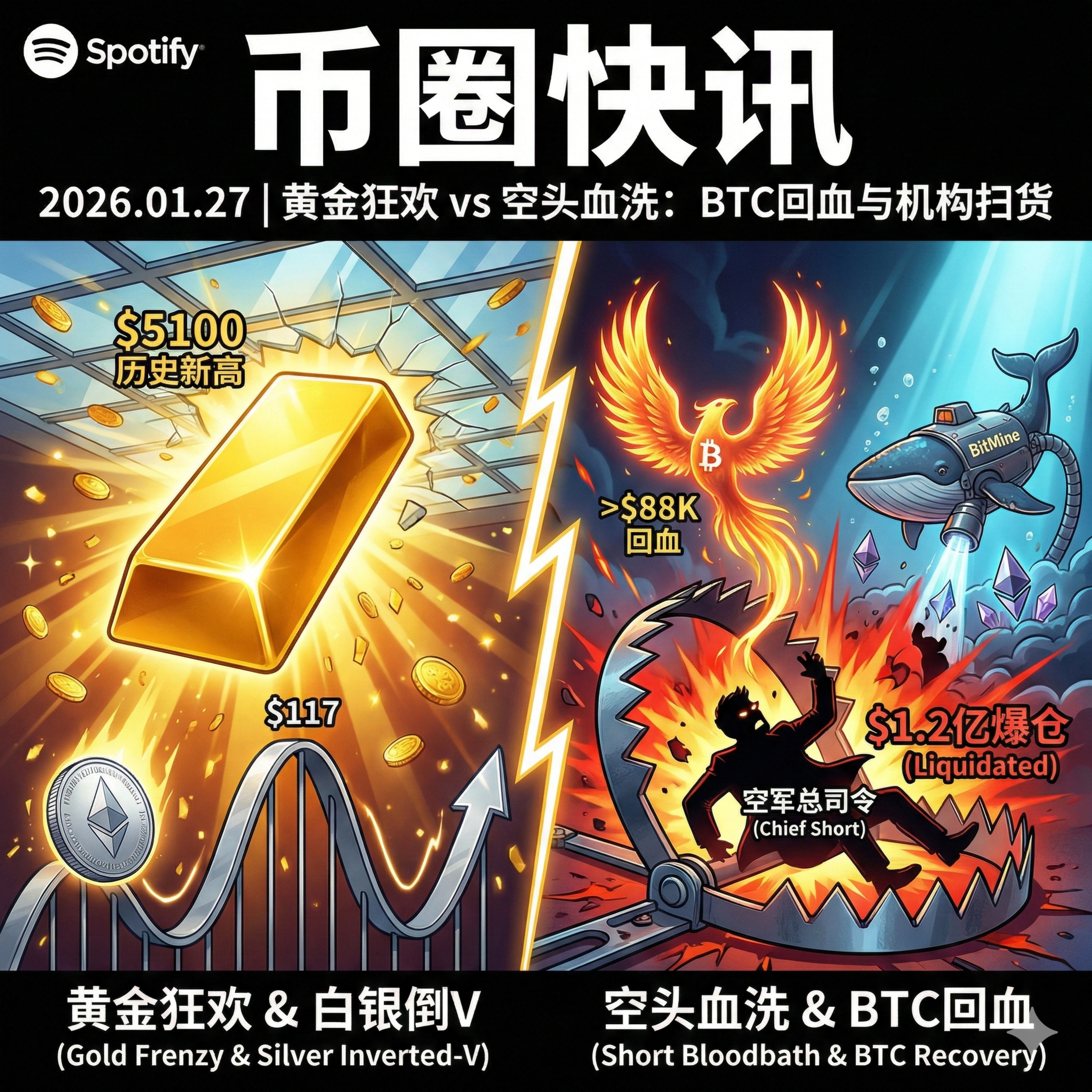 今天是 2026 年 1 月 27 日。今日市场的关键词是“贵金属狂欢”与“空头血洗”。现货黄金势如破竹突破 5100 美元,而比特币在经历了暴跌后强劲回升至 8.8 万美元上方。这场反弹成为了空头的噩梦,链上最大的空头巨鲸单日爆仓 1.2 亿美元。与此同时,机构并未停下脚步,BitMine 继续疯狂吞噬以太坊流动性,而特朗普对韩国的关税大棒让宏观局势再添变数。