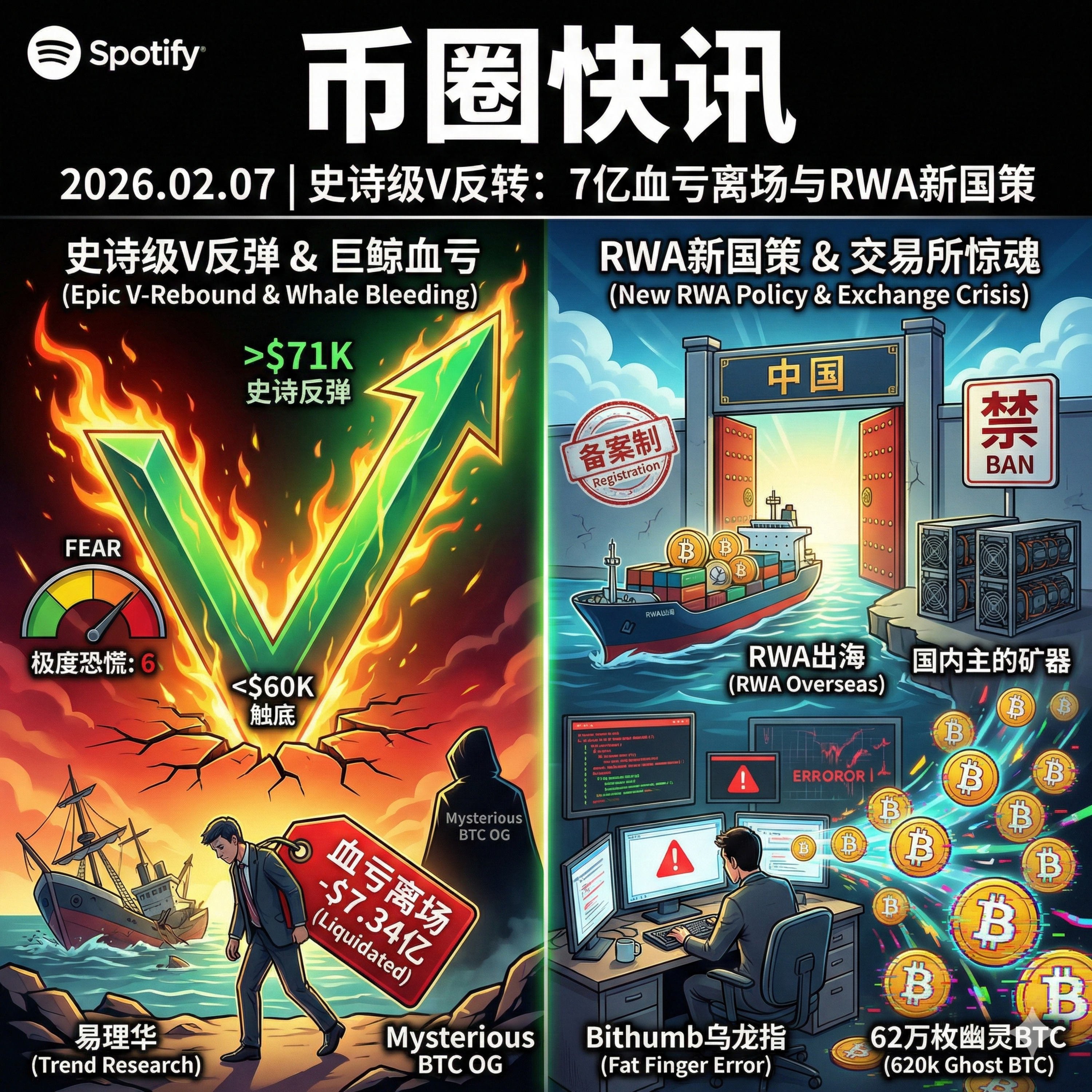 今天是 2026 年 2 月 7 日。经历了连续数日的恐慌性杀跌后,加密市场今日上演了史诗级的 “V 型反转”。比特币创下本轮周期单日最大涨幅,重新站上 7 万美元关口。然而,在反弹的狂欢背后,是易理华(Trend Research)高达 7 亿美元的血泪止损,以及韩国交易所 Bithumb 惊天乌龙引发的信任危机。更重磅的是,中国监管层今日密集发声,为 RWA(现实世界资产)出海划定了一条“严管但允许”的新赛道。