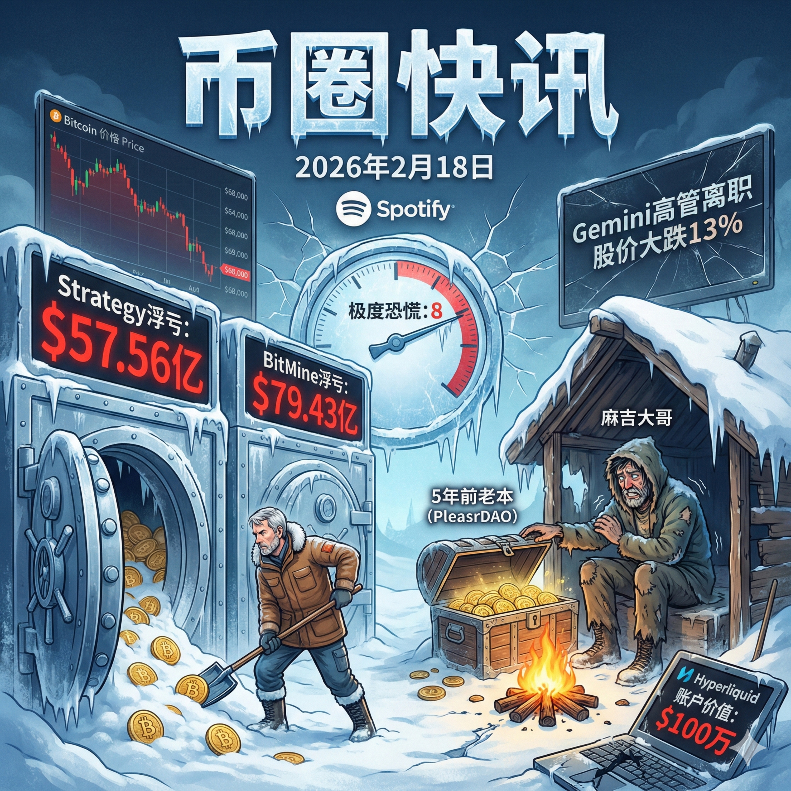今天是 2026 年 2 月 18 日。尽管比特币试图站稳 6.8 万美元关口,但市场的寒意却在加剧,加密恐慌指数跌至 8(极度恐慌)。今天的市场是机构与巨鲸的“绞肉机”:MicroStrategy 和 BitMine 两大财库顶着合计超 130 亿美元的浮亏继续加仓,而昔日的大户“麻吉大哥”似乎已弹尽粮绝,竟开始动用 5 年前的“老本”来维持仓位。