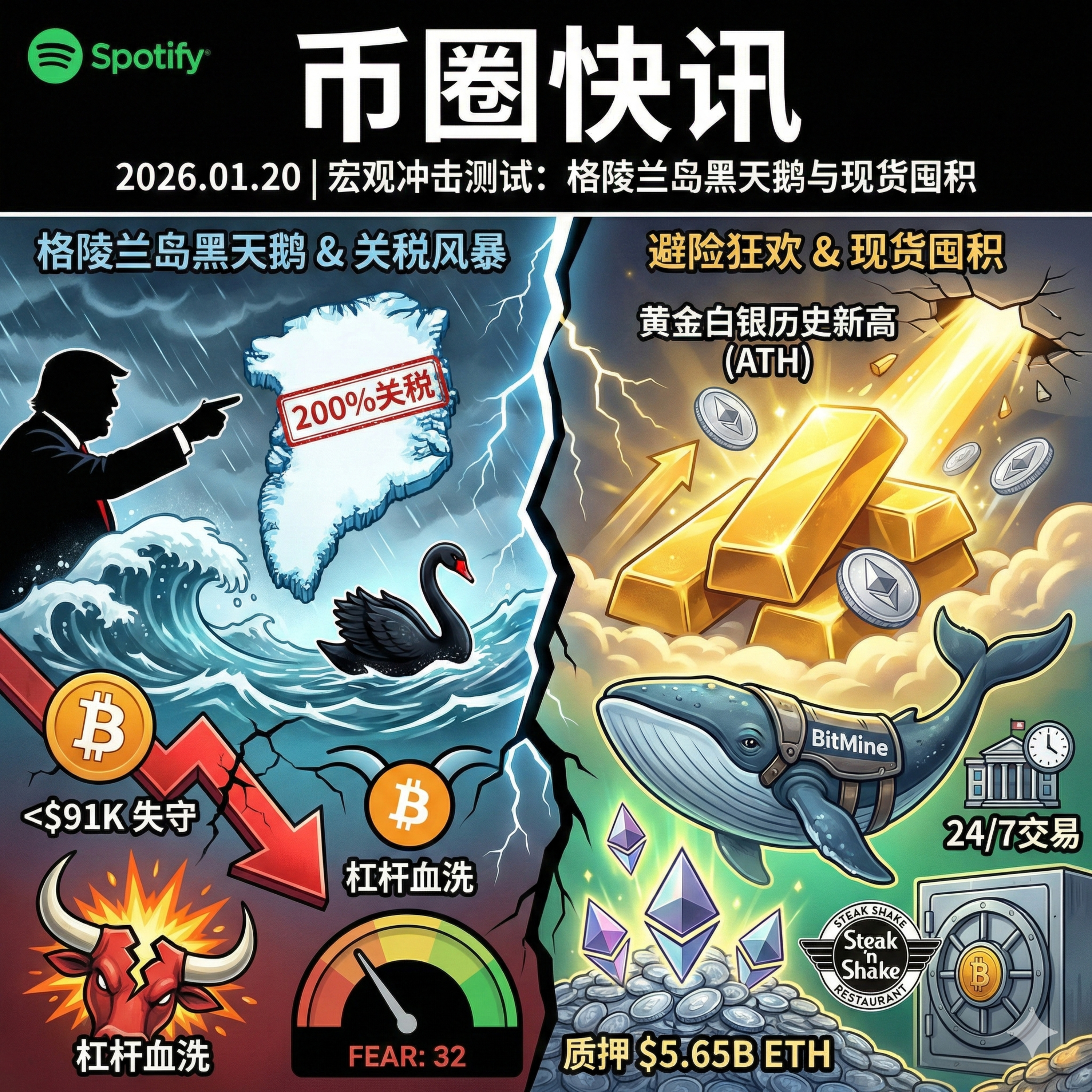 今天是 2026 年 1 月 20 日。今日全球金融市场被一只名为“格陵兰岛”的地缘政治黑天鹅彻底搅动。特朗普的关税威胁引发了传统市场与加密市场的双重震荡,避险资产黄金与白银双双创下历史新高,而比特币则跌破 9.1 万美元,多头巨鲸遭遇了残酷的去杠杆清洗。