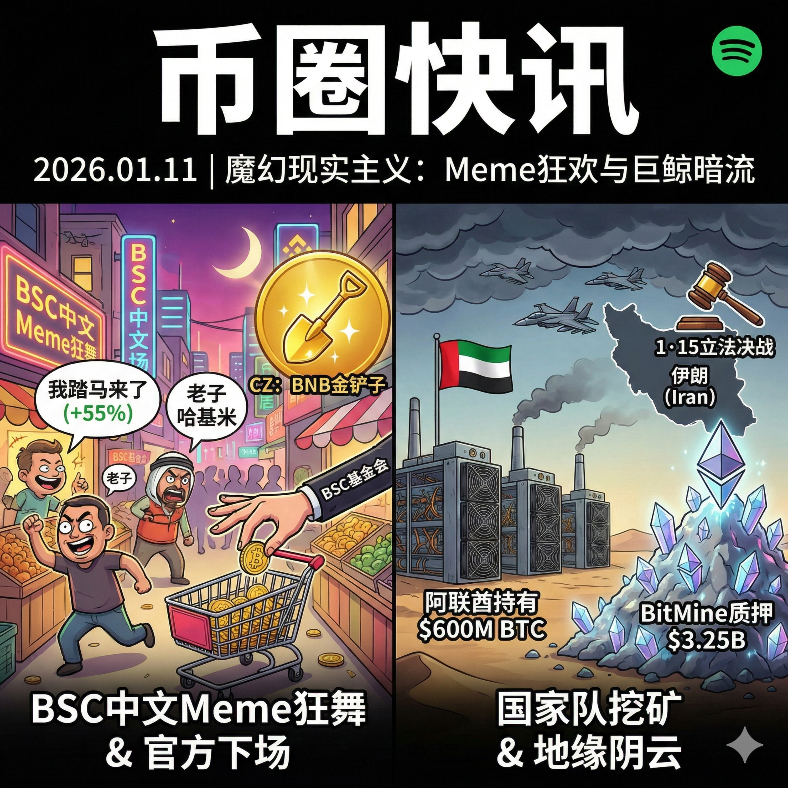 今天是 2026 年 1 月 11 日。如果用一个词来形容今天的加密市场,那就是“魔幻现实主义”。比特币企稳在 9.1 万美元上方,但市场的注意力却完全被一场荒诞的中文 Meme 狂欢抢走。BSC 链上大量以粗鄙用语或币安高管语录命名的代币集中爆发,甚至引来官方基金会亲自下场“扫货”。与此同时,中东局势升温、黑客资金加速洗钱,而真正的巨鲸们仍在沉默中持续囤积筹码。