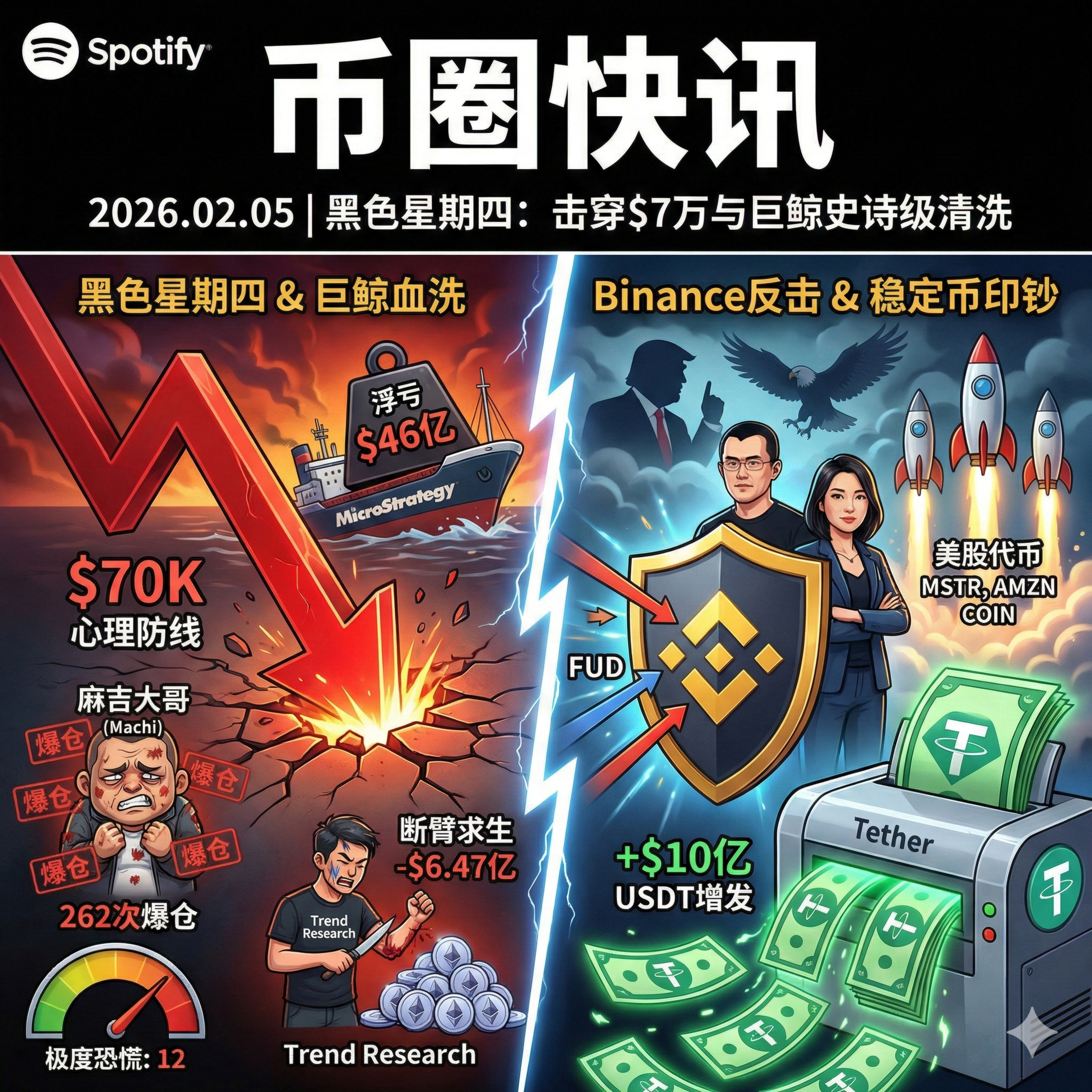 市场的“去杠杆”进程已进入最残酷的阶段。当比特币击穿 7 万美元、MicroStrategy 浮亏 46 亿时,说明机构的成本线防守已经失守。易理华的巨额割肉和麻吉大哥的连续爆仓,标志着上一轮牛市的激进多头正在被彻底清洗。但另一方面,Binance 逆势上线美股合约、Tether 持续增发稳定币,以及贝莱德等机构在底部的抄底动作,,或许暗示着在极度恐慌(指数 12)的废墟之下,新的秩序正在重建。