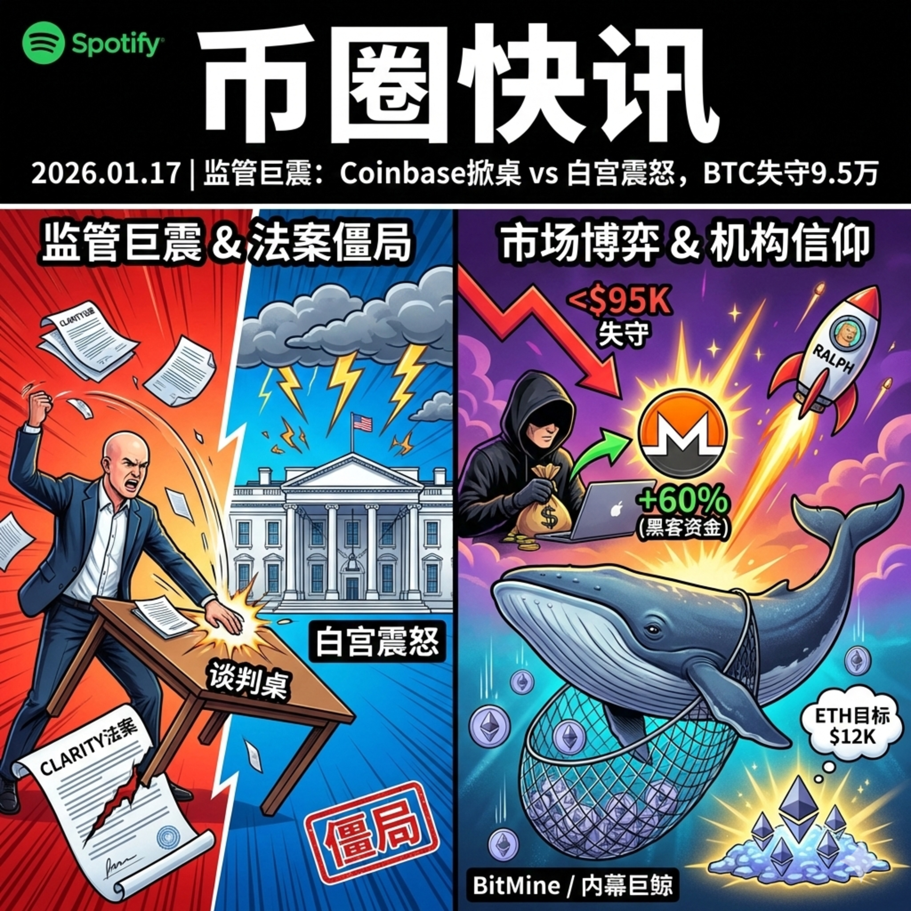 今天是 2026 年 1 月 17 日。加密市场在周末迎来了激烈的多空博弈,同时监管层面出现戏剧性转折。Coinbase 与白宫在加密立法上的正面冲突,使《CLARITY 法案》陷入僵局;比特币跌破 9.5 万美元关键位,而美联储主席人选的突然反转,正在重新定价宏观预期。