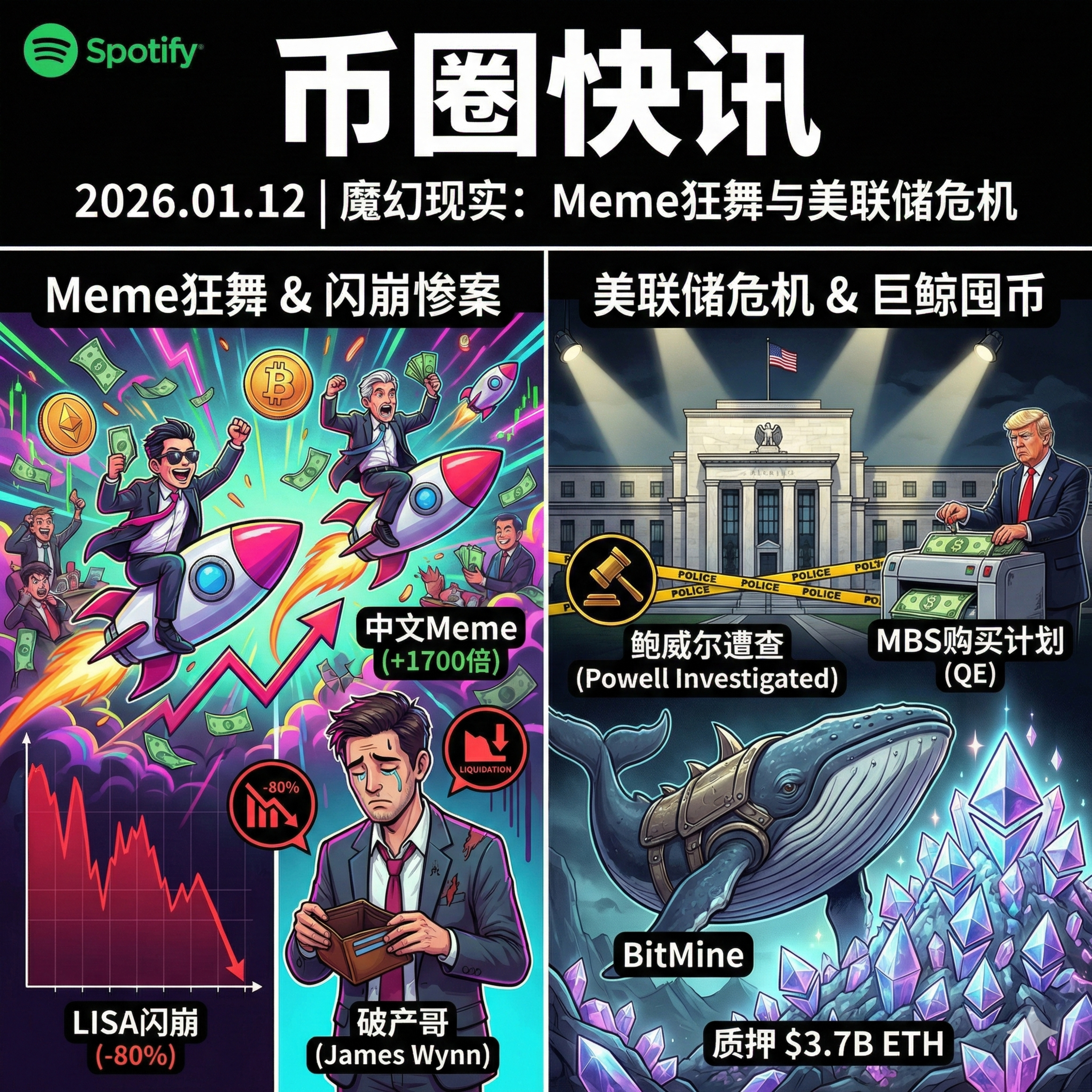 今天是 2026 年 1 月 12 日。加密市场呈现出一种极度撕裂的“魔幻现实主义”画风:一边是中文 Meme 币百倍神话与归零惨案齐飞,另一边是宏观层面爆出美联储主席鲍威尔遭刑事调查的重磅消息,甚至引发关于央行独立性的宪政危机讨论。与此同时,链上巨鲸的悲喜并不相通——BitMine 继续豪掷几十亿美元死多以太坊,而散户偶像“破产哥”的账户却再次逼近归零。