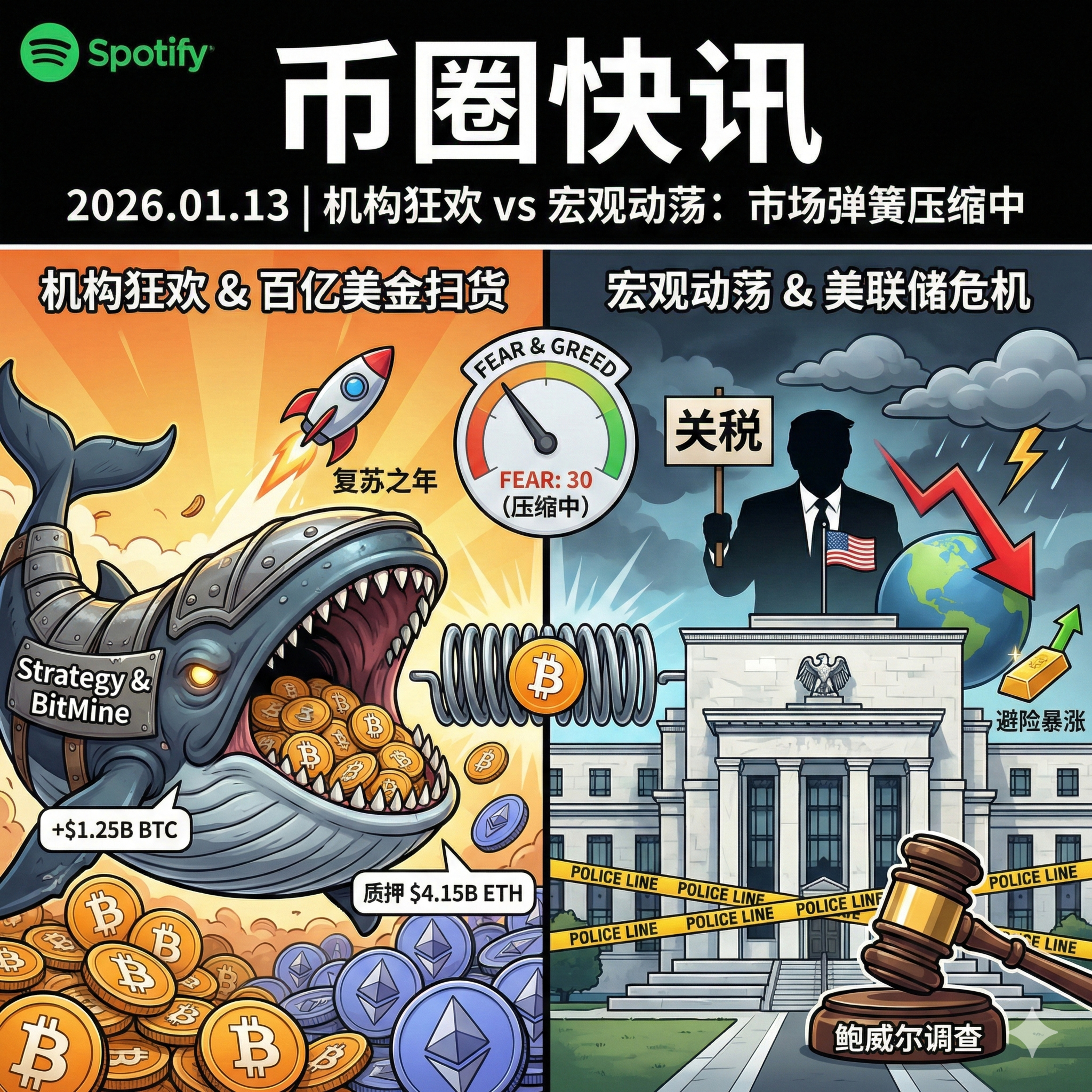 今天是 2026 年 1 月 13 日。加密市场正处在一个宏观动荡与机构狂欢交织的关键节点。比特币重新站上 9.2 万美元,而华尔街与白宫围绕美联储独立性的博弈已进入白热化阶段。与此同时,顶级机构正以前所未有的速度吞噬市场筹码,为 2026 年的“复苏之年”提前布局。