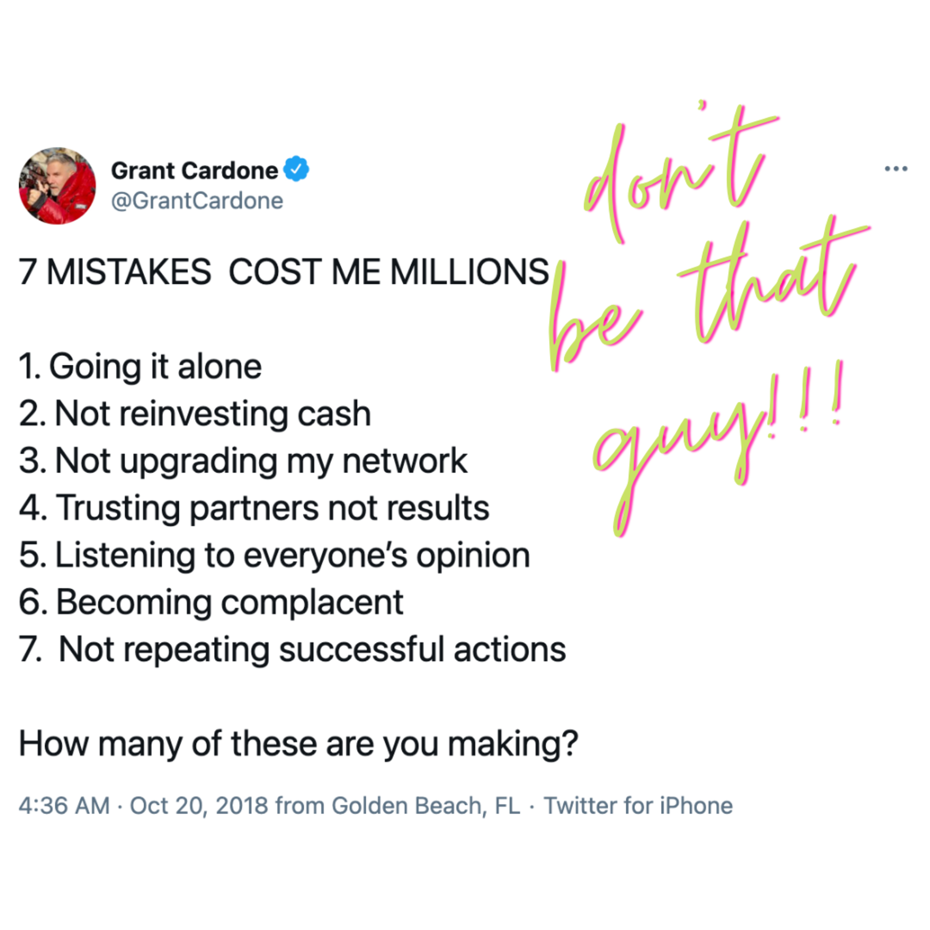 Grant Cardone's 7 Mistakes Costing You Millions From a 3 year old Tweet comes 7 revelations from Grant Cardone that from Grant's point of view and hindsight being 20/20 and all has cost him millions. Knowing what not to do is as important as knowing what to do, wouldn't you agree? So what can we learn from Grant about what not to do? But before we list off the 7 mistakes costing you millions, let's cover a few things and confront a few truths so that we are most receptive to the 7. Are you a millionaire already? How much money do you have left to go to get there? What do you know already about becoming a millionaire? Lastly, what do you NOT know about becoming a millionaire? Use these 7 mistakes costing you millions to literally create a game plan to create the financial freedom and life you want and deserve. https://cardonesolutions.com/7-mistakes-costing-you-millions/