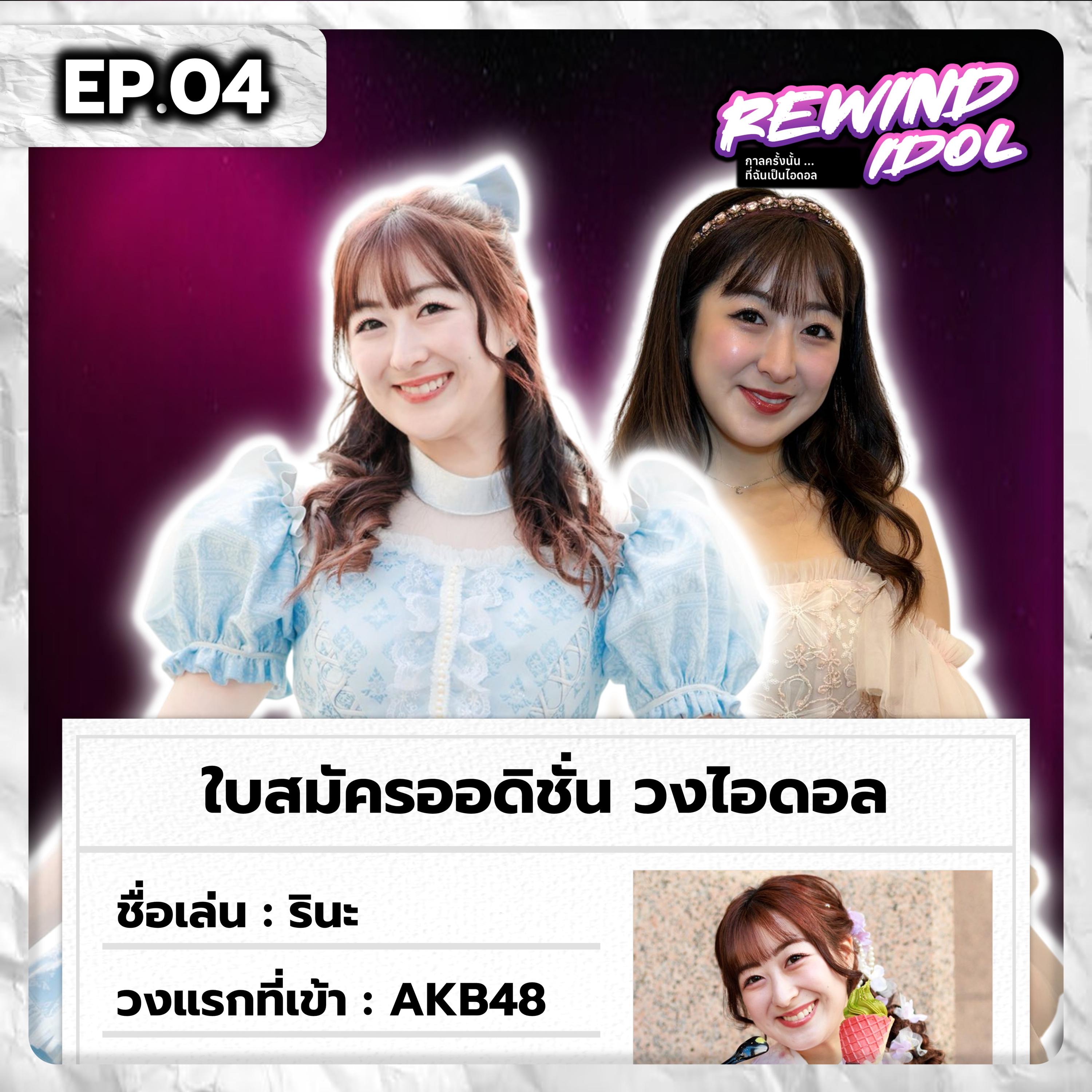 "Rewind Idol" ชวนย้อนเวลาและความรู้สึกไปกับอดีตเมมเบอร์จากวงไอดอลแดนอาทิตย์อุทัย AKB48 อย่าง "รินะ อิซึตะ" จากเส้นทางไอดอลสุดหินที่ญี่ปุ่น สู่มิตรภาพครั้งใหม่ในไทย และเส้นทางที่ได้ทำอะไรหลาย ๆ อย่าง ในฐานะเบื้องหน้าและเบื้องหลัง