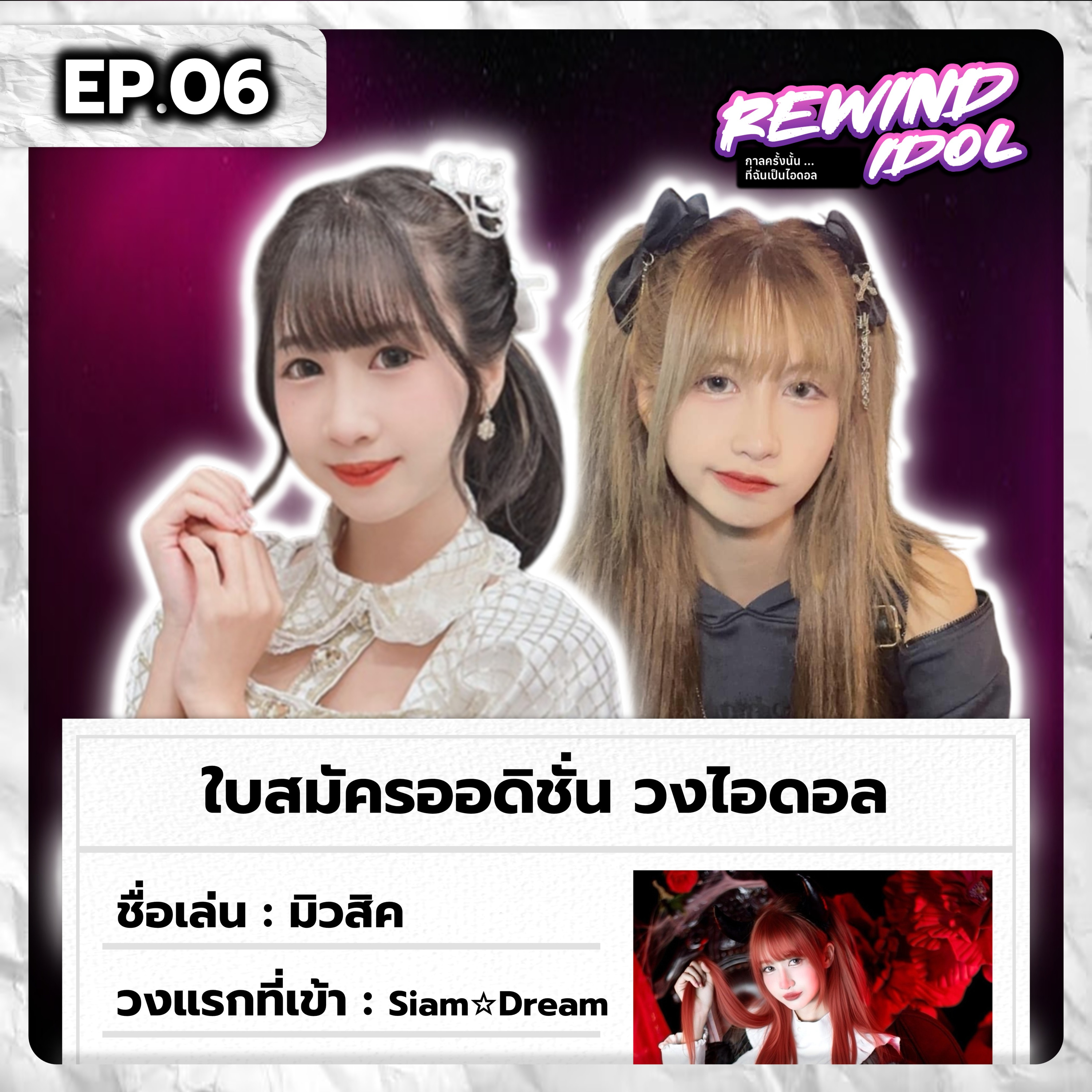 "Rewind Idol" ชวนย้อนเวลาและความรู้สึกไปกับอดีตเมมเบอร์จากวงไอดอล Siam☆Dream อย่าง "มิวสิค Muzicsosick" ผู้ที่ไม่เคยเป็นไอดอลมาก่อน แต่ต้องมาเจองานยาก เพียงเพราะความมุ่งมั่นที่อยากจะพบเจอสาวน่ารัก ๆ ของเธอ!?▣ ช่องทางการติดตาม「มิวสิค Muzicsosick」《Facebook》 https://www.facebook.com/music.siamdream