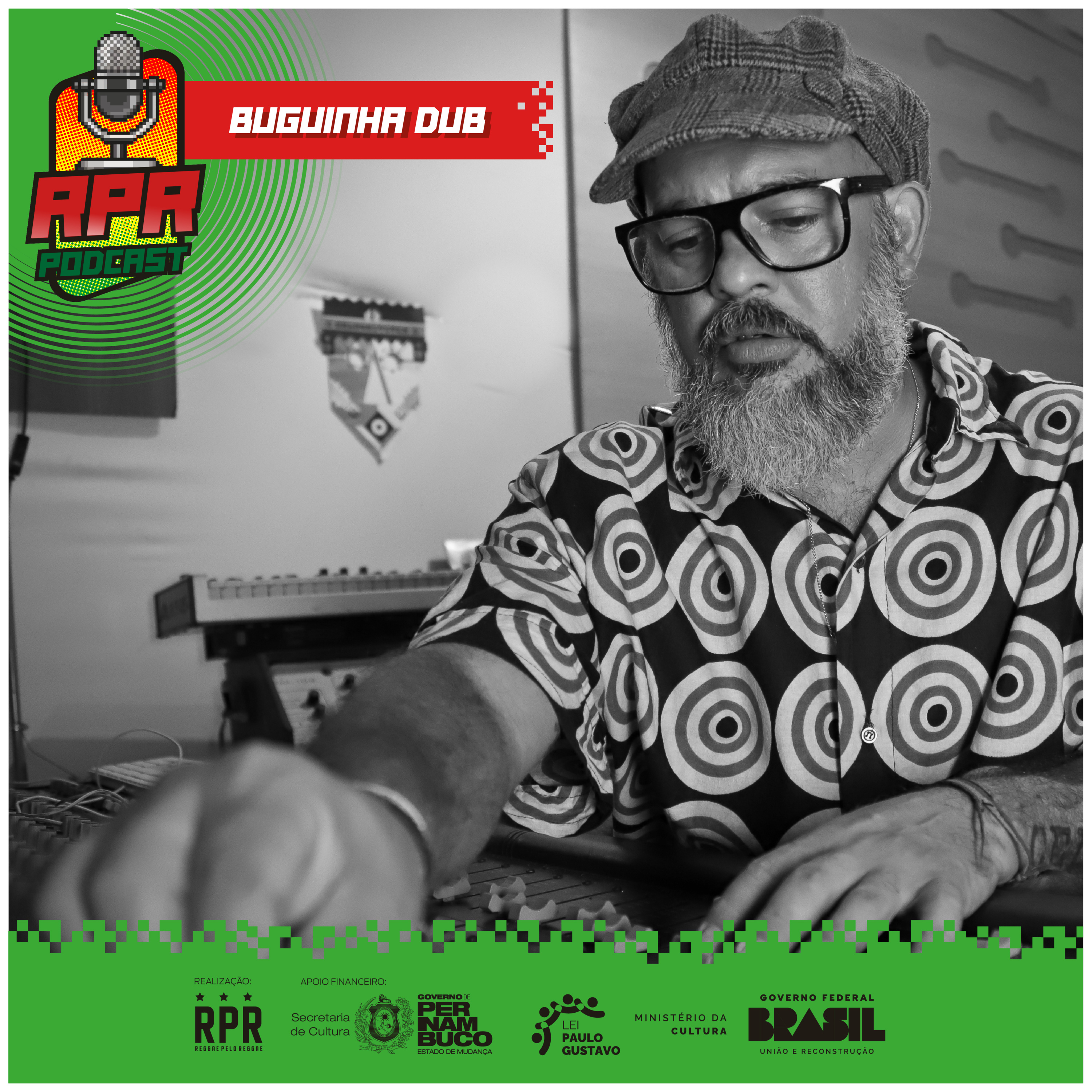 [Imagem: Card do episódio com uma foto em preto e branco de Buguinha Dub. Ele tem barba e bigode grisalhos, usa óculos de armação escura e um boné xadrez. Veste uma camisa com estampa de círculos concêntricos e opera uma mesa de som com a mão direita sobre os faders. No canto superior esquerdo, o logo do RPR Podcast e "BUGUINHA DUB" em destaque com tipografia pixelada. Na base, os logos dos realizadores e apoiadores do projeto.]