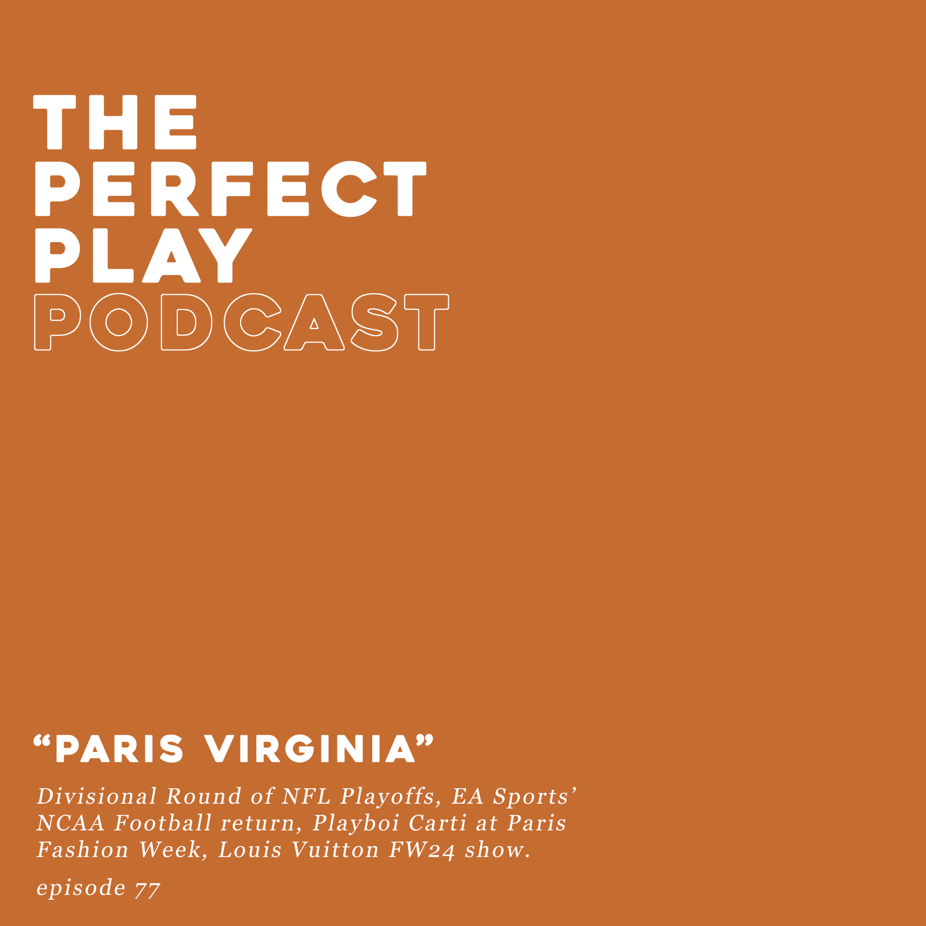 In Episode 77 of The Perfect Play Podcast, hosts Huey and Cortez preview the Divisional Round of NFL Playoffs, discuss the return of EA Sports’ NCAA Football, cover Playboi Carti at Paris Fashion Week, and explore Pharrell’s Louis Vuitton Fall/Winter 2024 show.