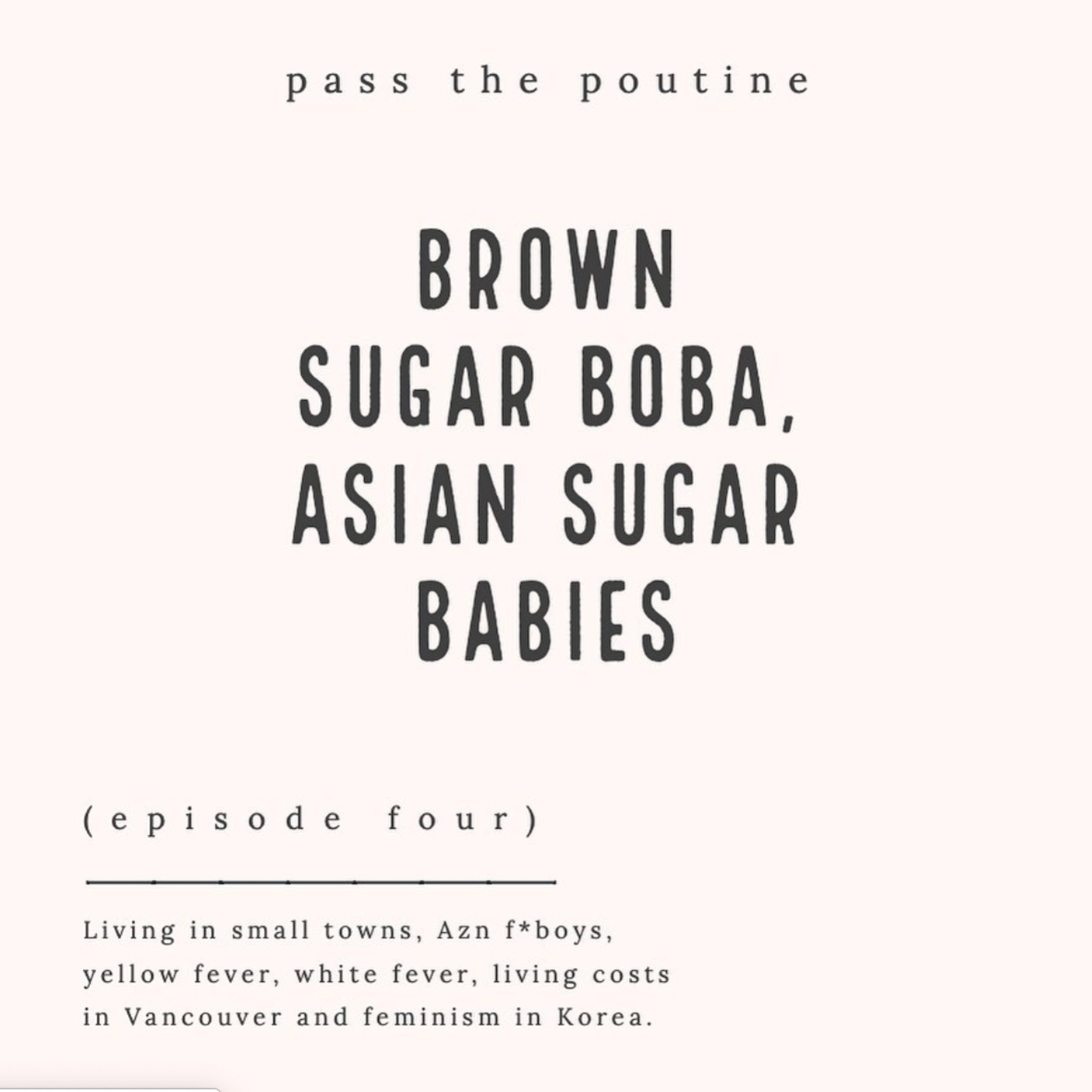 This week, we discuss Vancouver being the loneliest city in Canada (2:45), being the only Asian in Fort St. James (7:08), only dating white guys as an Asian woman (11:15), yellow fever (12:46), Azn f*boys with small ... (18:24), online dating apps (22:33), sugar babies (27:30), living costs in Vancouver (33:15), Korean Canadians versus Korean International Students (35:25), feminism and the Escape Corset in Korea (41:00). Theme music is Piano & Sax by Joakim Karud.