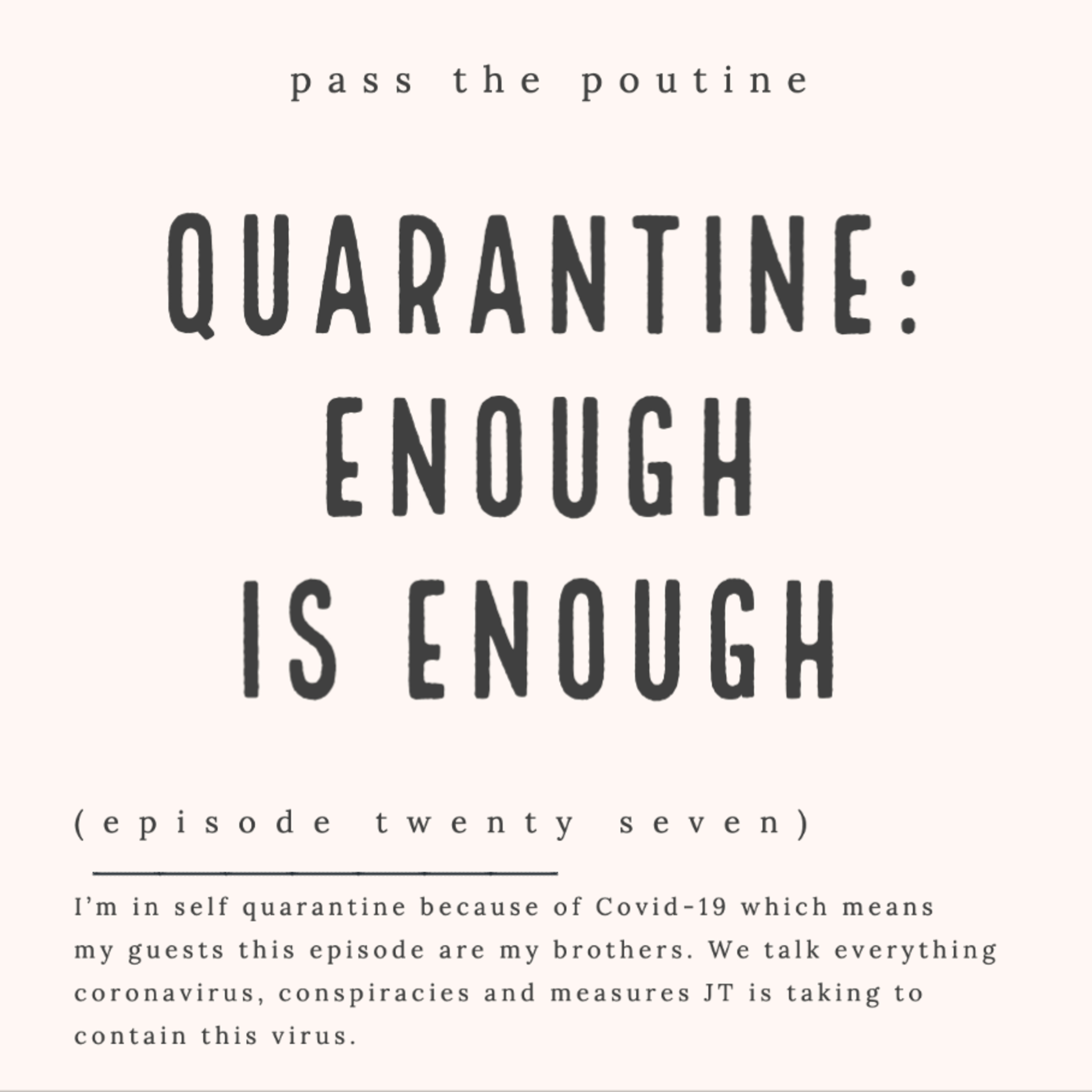 Canadian Prime Minister Justin Trudeau is fed up with us frequenting beaches, going on hikes and doing normal spring things. Enough is enough, go home and stay home. I'm in self isolation so my brothers are my guests this week. We talk about people losing jobs (00:38), state of emergency (2:13), teachers (4:20), how long is this quarantine gonna last (6:50), results of this pandemic (8:55), everyone is wearing masks (11:10), gun sales are going up (17:19), workers taking leave (19:10), starting a garden (20:40), Animal Crossing (21:55) and more.
