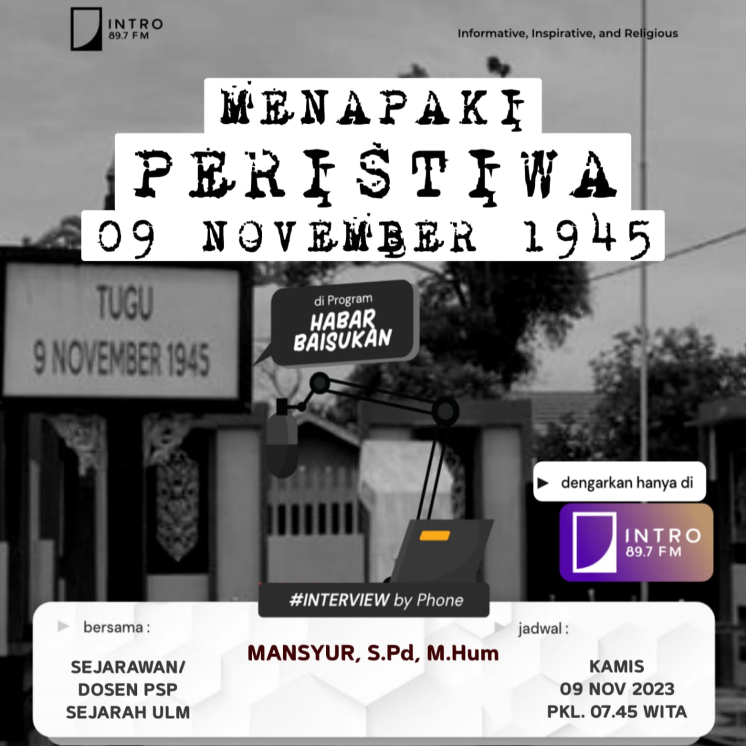 Ikuti perbincangan "Menapaki Peristiwa 09 November 1945" bersama seorang Sejarawan yang juga Dosen Program Studi Pendidikan Sejarah Universitas Lambung Mangkurat, Bpk. Mansyur, S.Pd., M.Hum