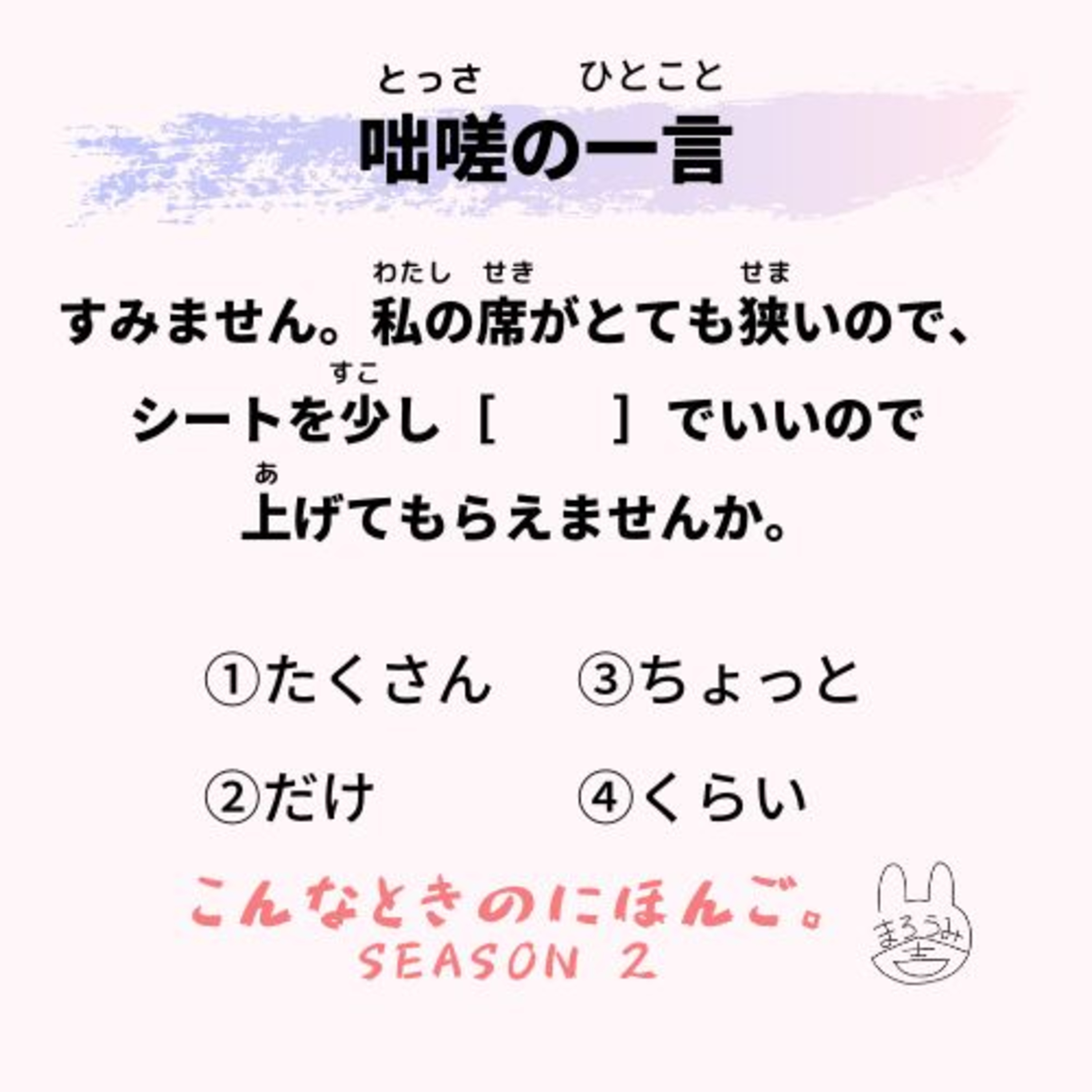 すみません。私の席がとても狭いので、シートを少し[ ]でいいので上げてもらえませんか。