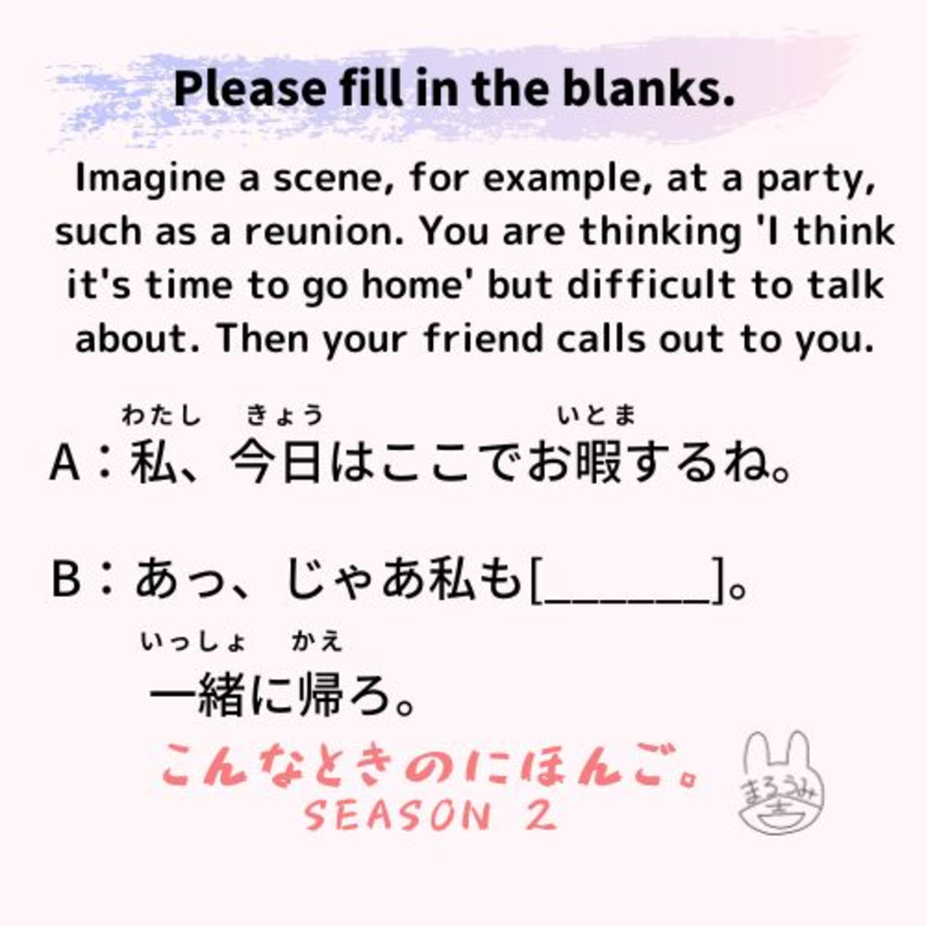 Imagine a scene, for example, at a party, such as a reunion. You are thinking 'I think it's time to go home' but difficult to talk about. Then your friend calls out to you.